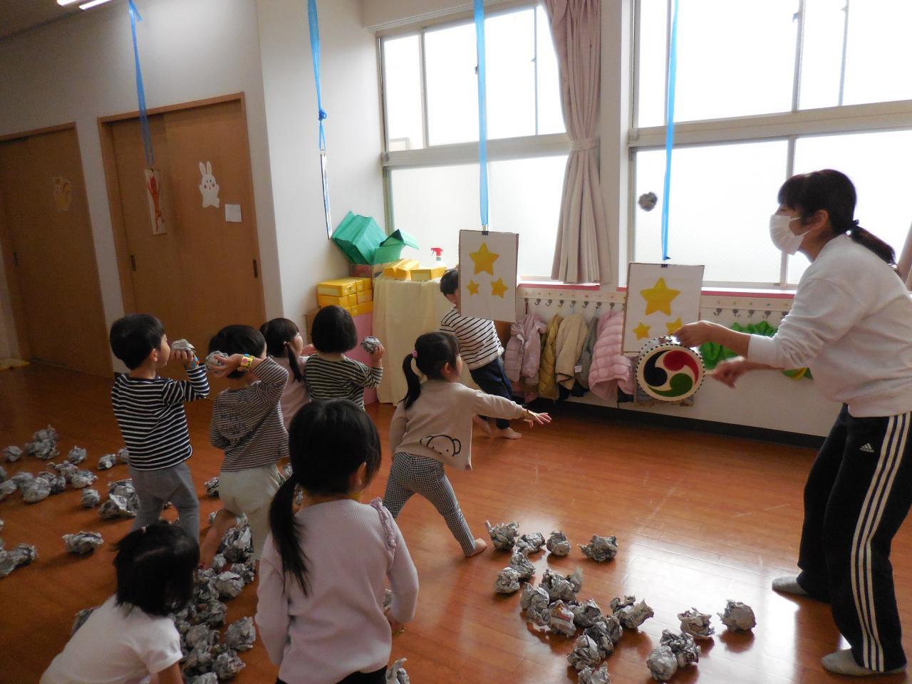 幼児組さんも豆まきを楽しみました。チームに分かれて豆まきゲームをしたり、心の中の追い出したいおにの発表をしました。