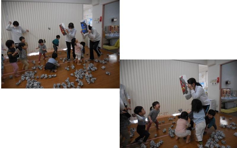 新聞紙で作った豆をおにさんに向かって「それ~!」