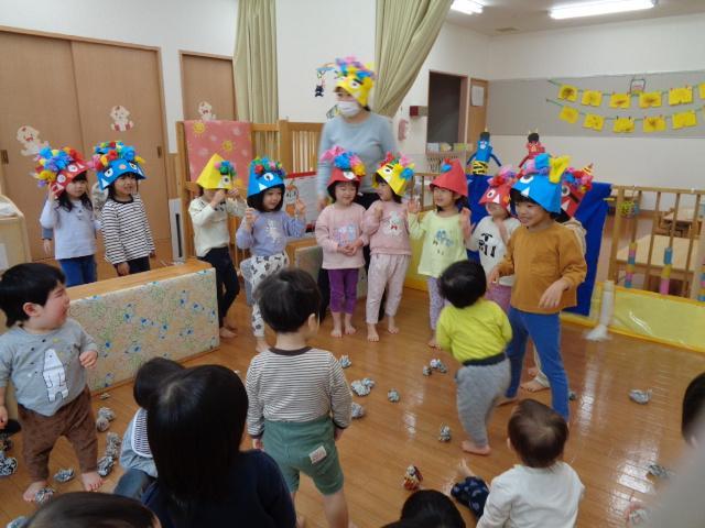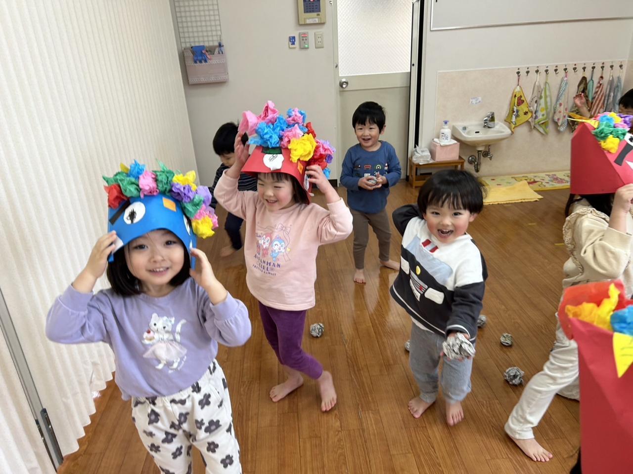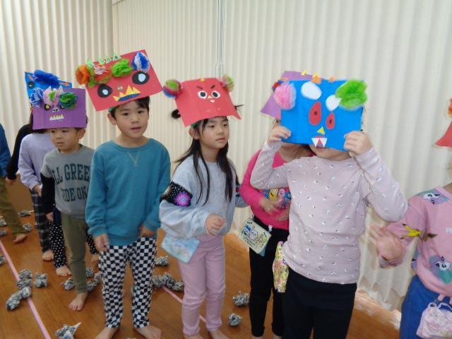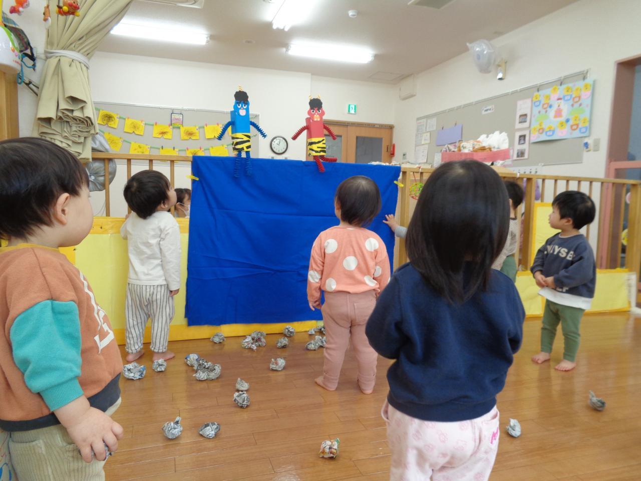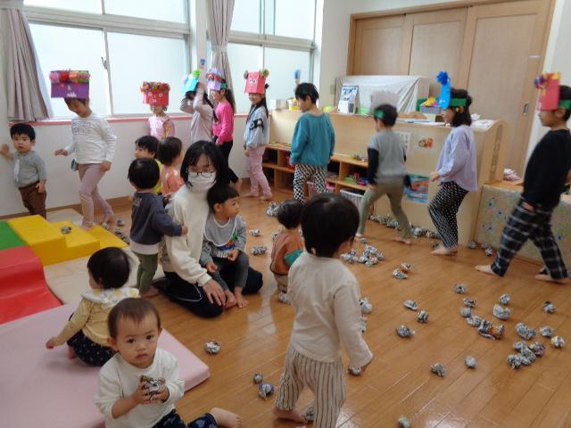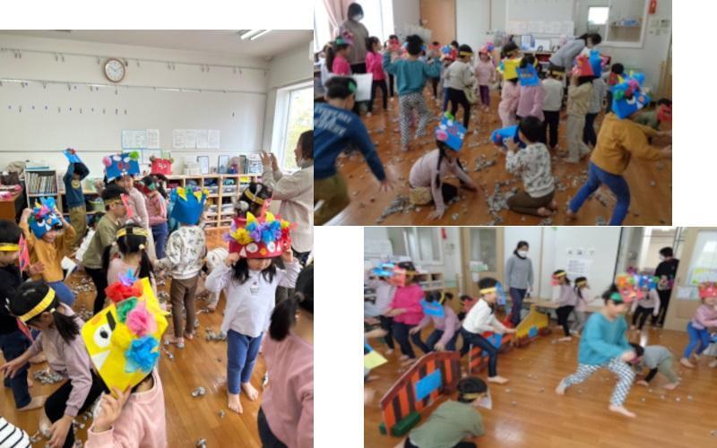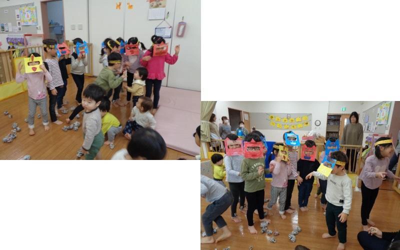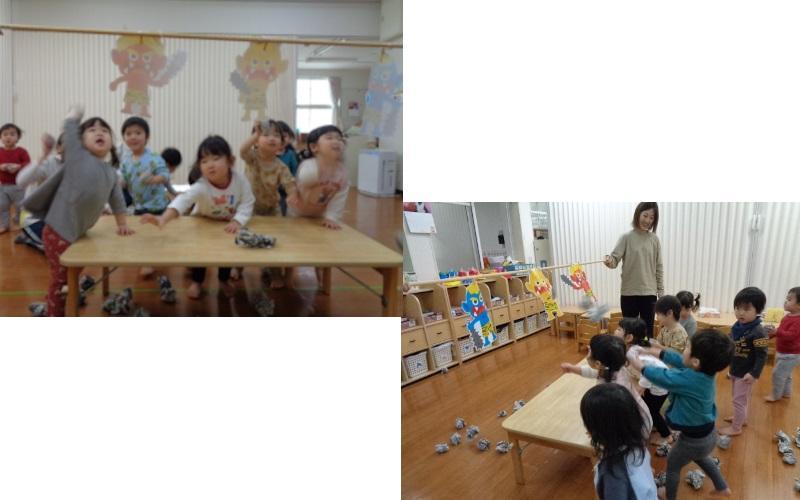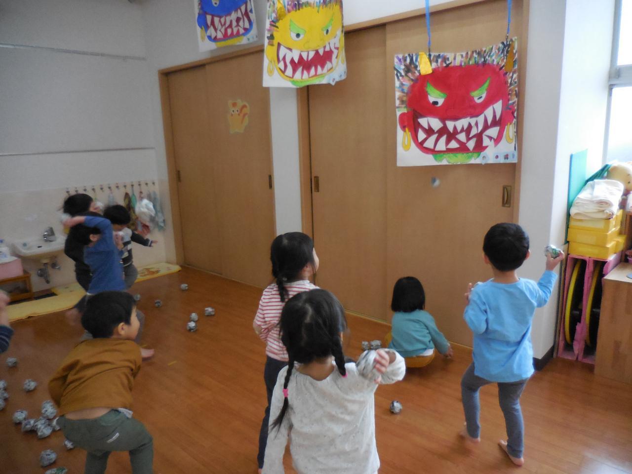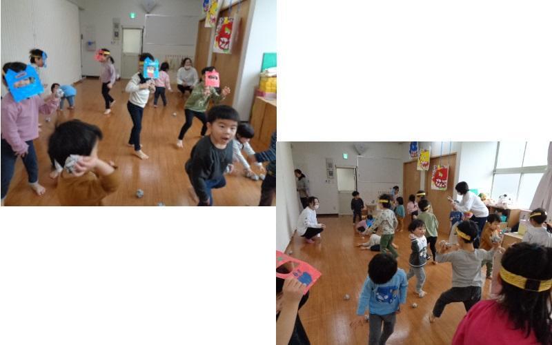 最後は、幼児組さんみんなで豆まきです!にぎやかな声がひびきます。