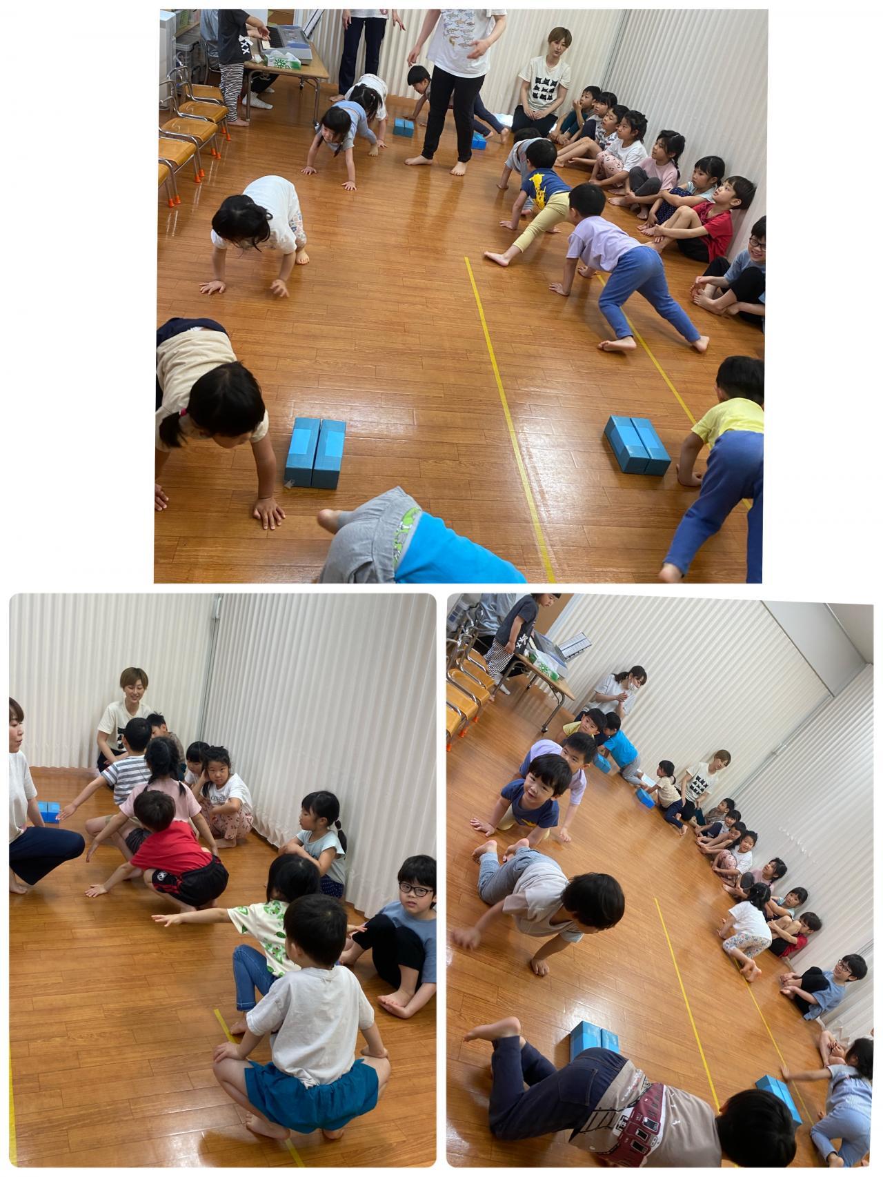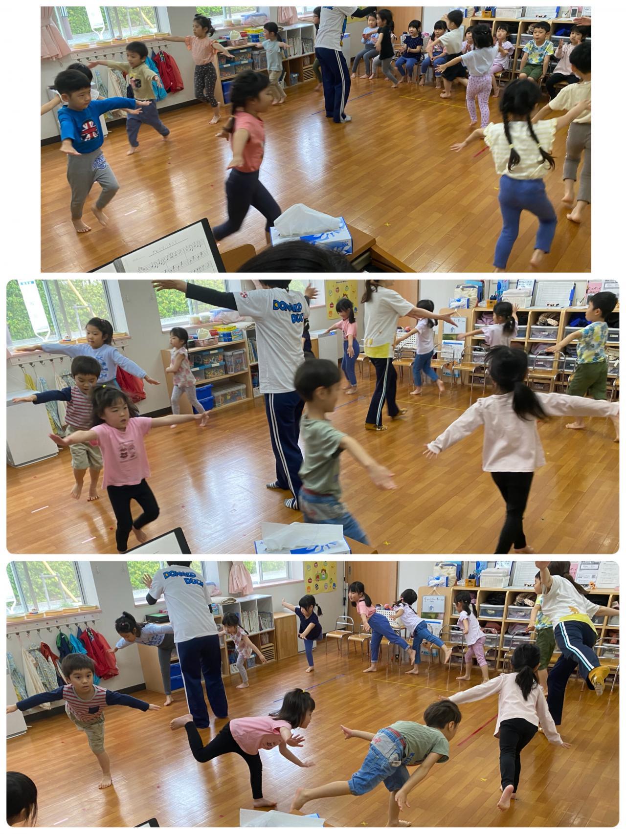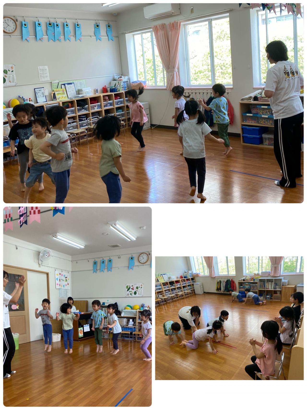 リズムです。音楽に合わせて身体を動かします。「ジャンプジャンプ!!」「おうまさんだよ~~」