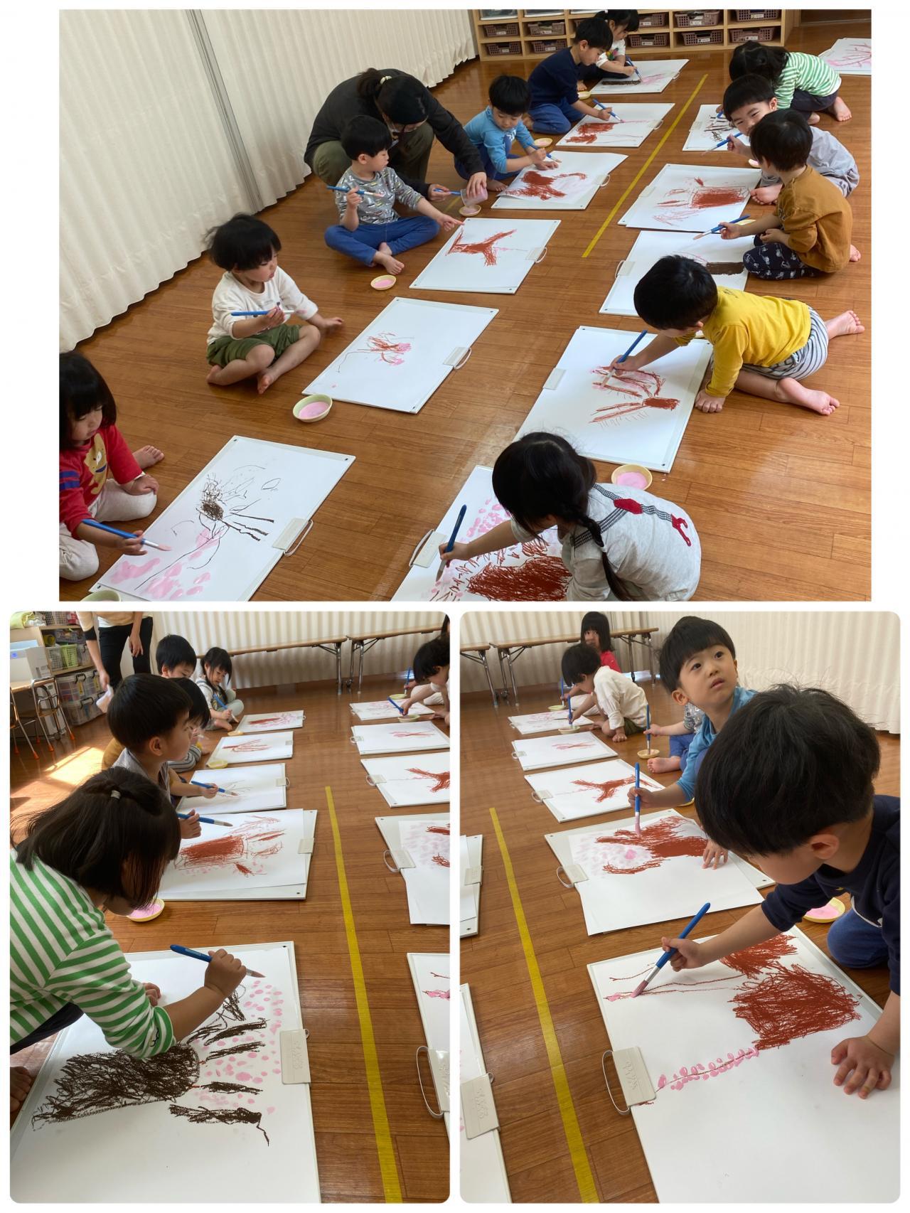 前日にお散歩で見に行った桜を思い出しながら描きます。「木は大きかったねぇ。」「えだもあっちこっちのびてたよ~」「花びらいっぱいあったね~」