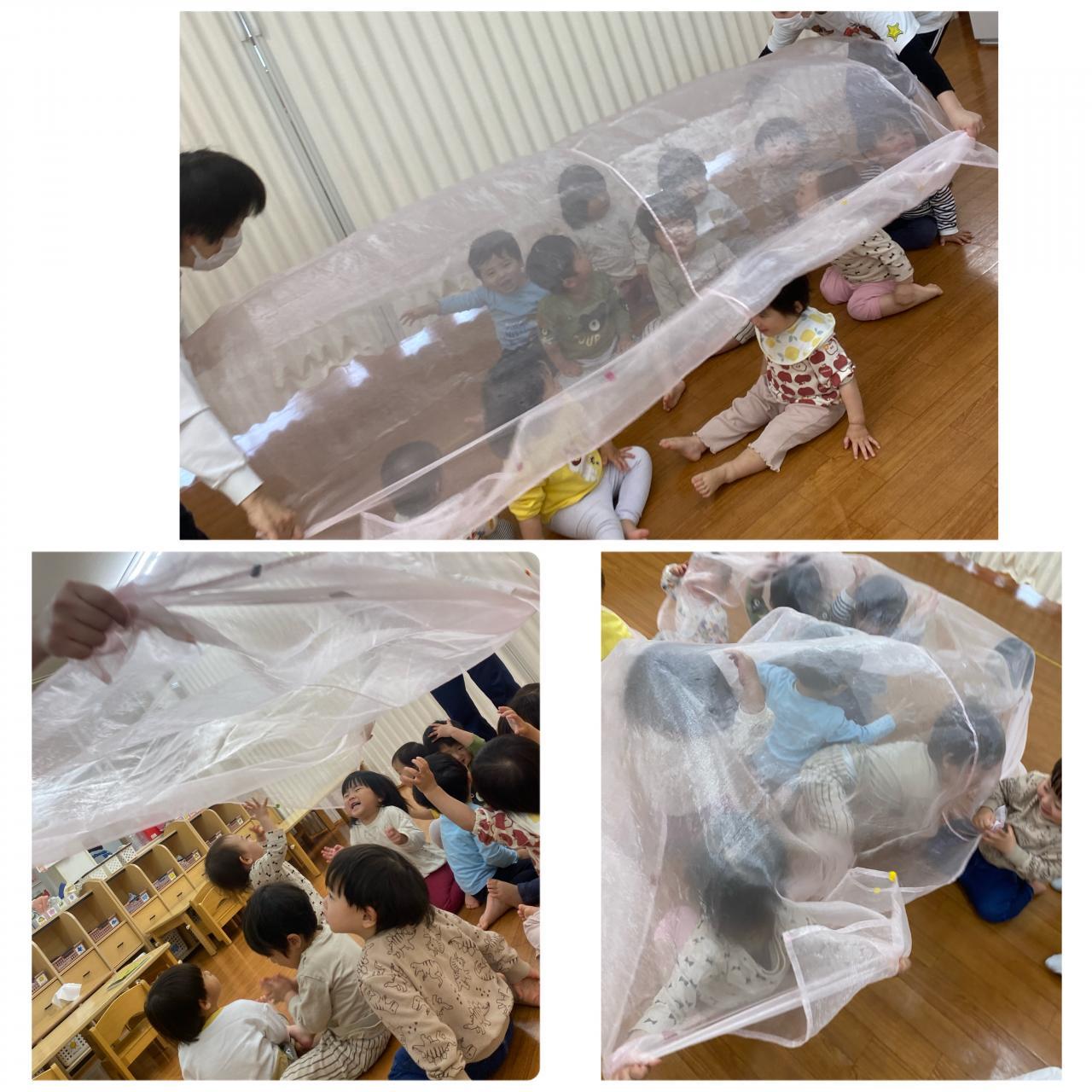 大きいオーガンジーで遊びました。「おおか~ぜこ~~い♪♪」と歌いながらオーガンジーをなびかせると、ひらひら舞う様子を楽しむりすさんです。最後は「ばぁ!」とめくって嬉しそうに遊んでいました。