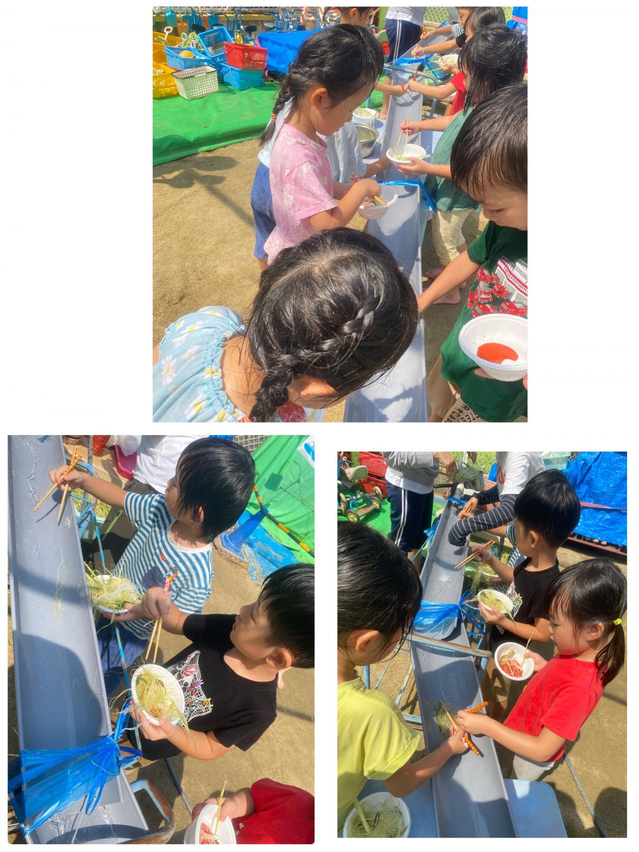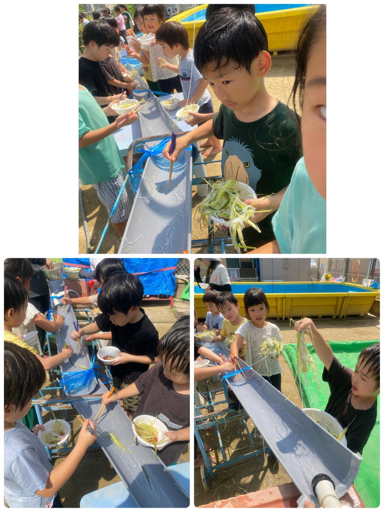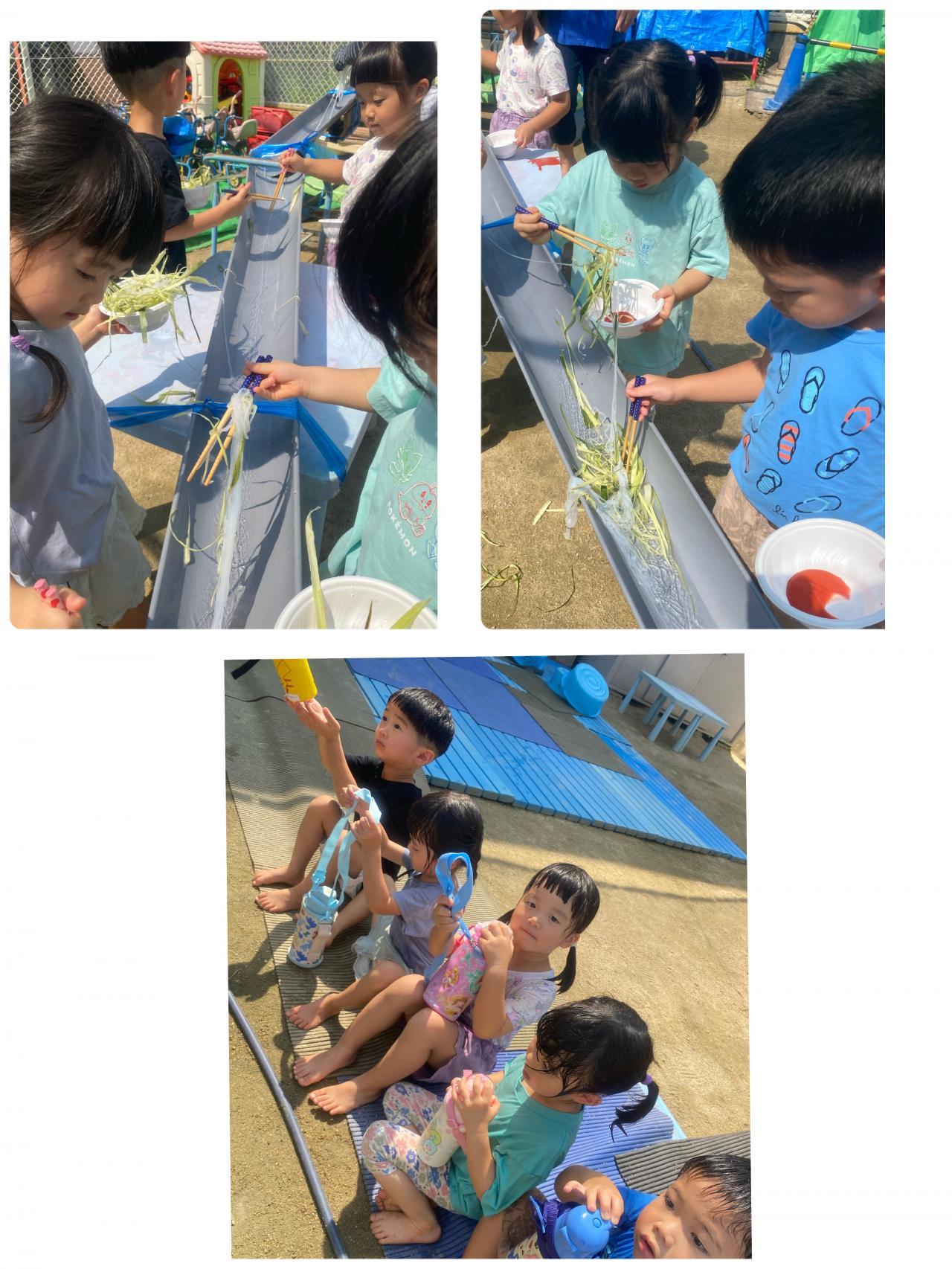 とうもろこしの皮とひげ、糸こんにゃくを使ってそうめん流しをしました。