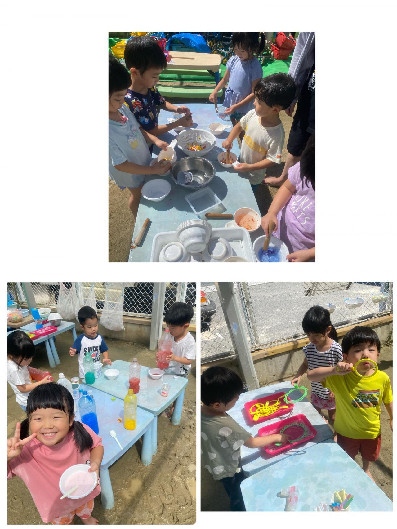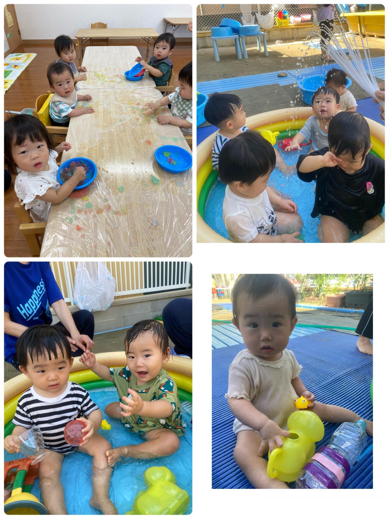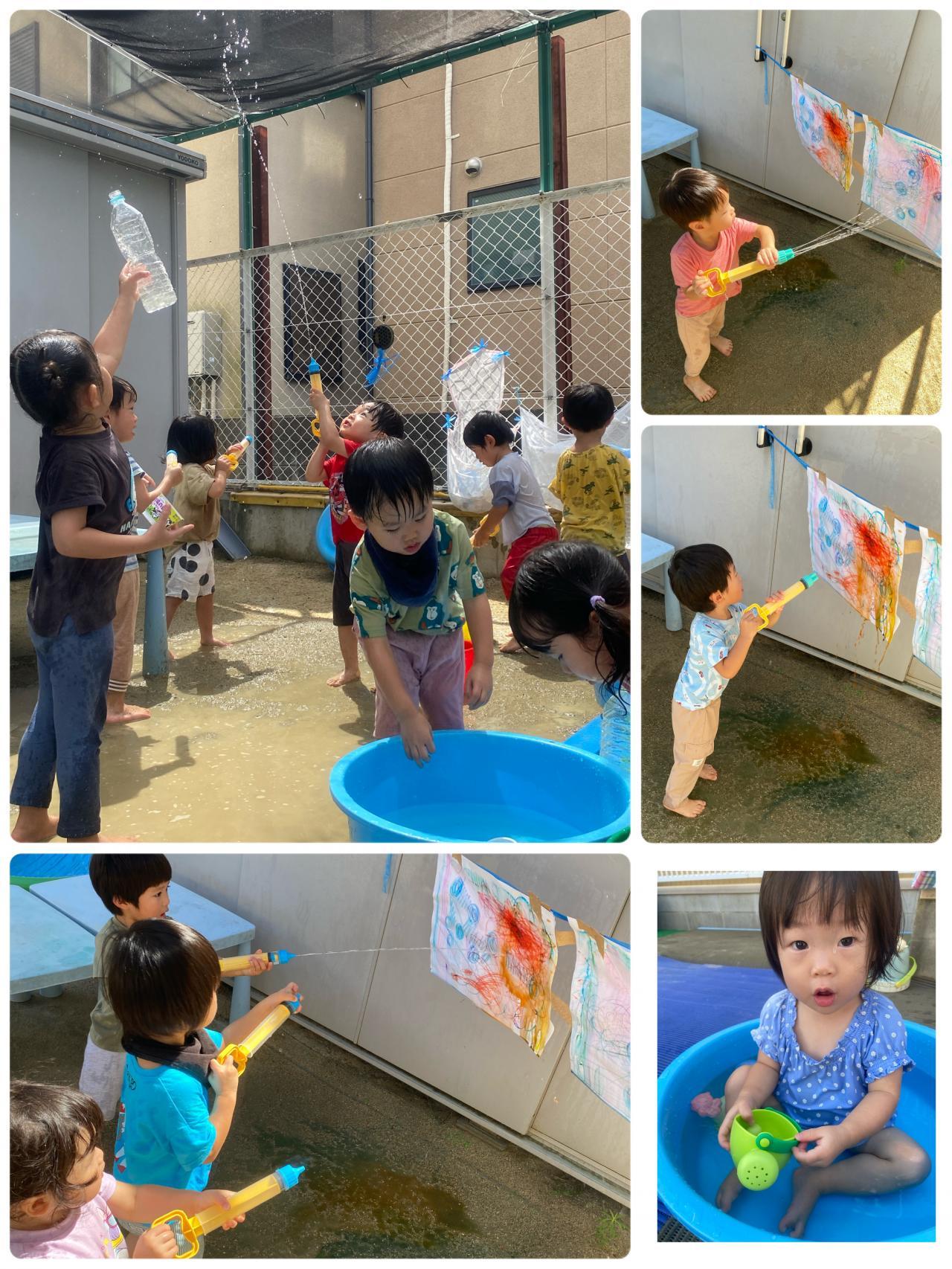 8月は水遊びを沢山しました。スーパーボールすくい、色水遊び、しゃぼんだま、水鉄砲、、、。好きなコーナーでめいっぱい遊びます。プールも沢山入りましたよ~(はいチーズ!さんの写真でお楽しみください)。
