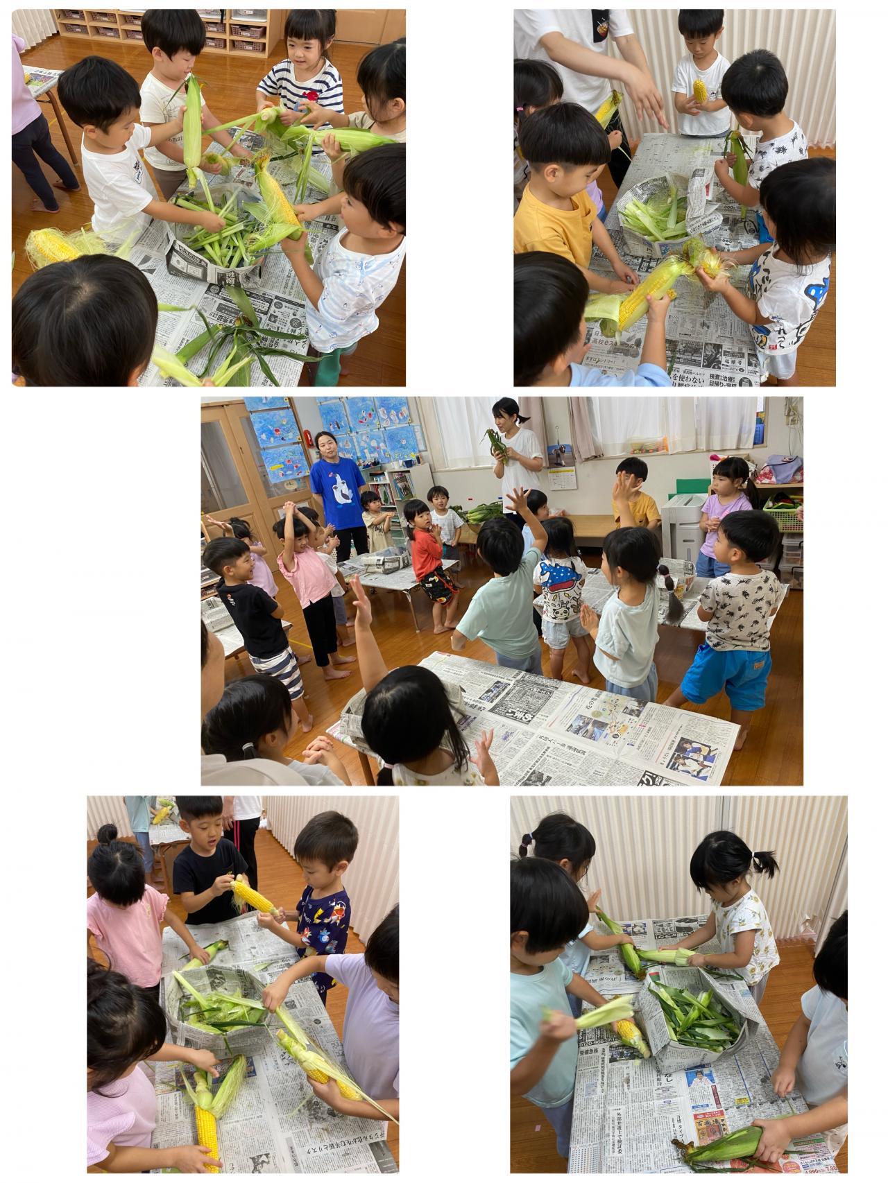 「かわがたくさんついてるね~」「まだかな、まだかな」「あ、とうもろこし出てきたよ~」