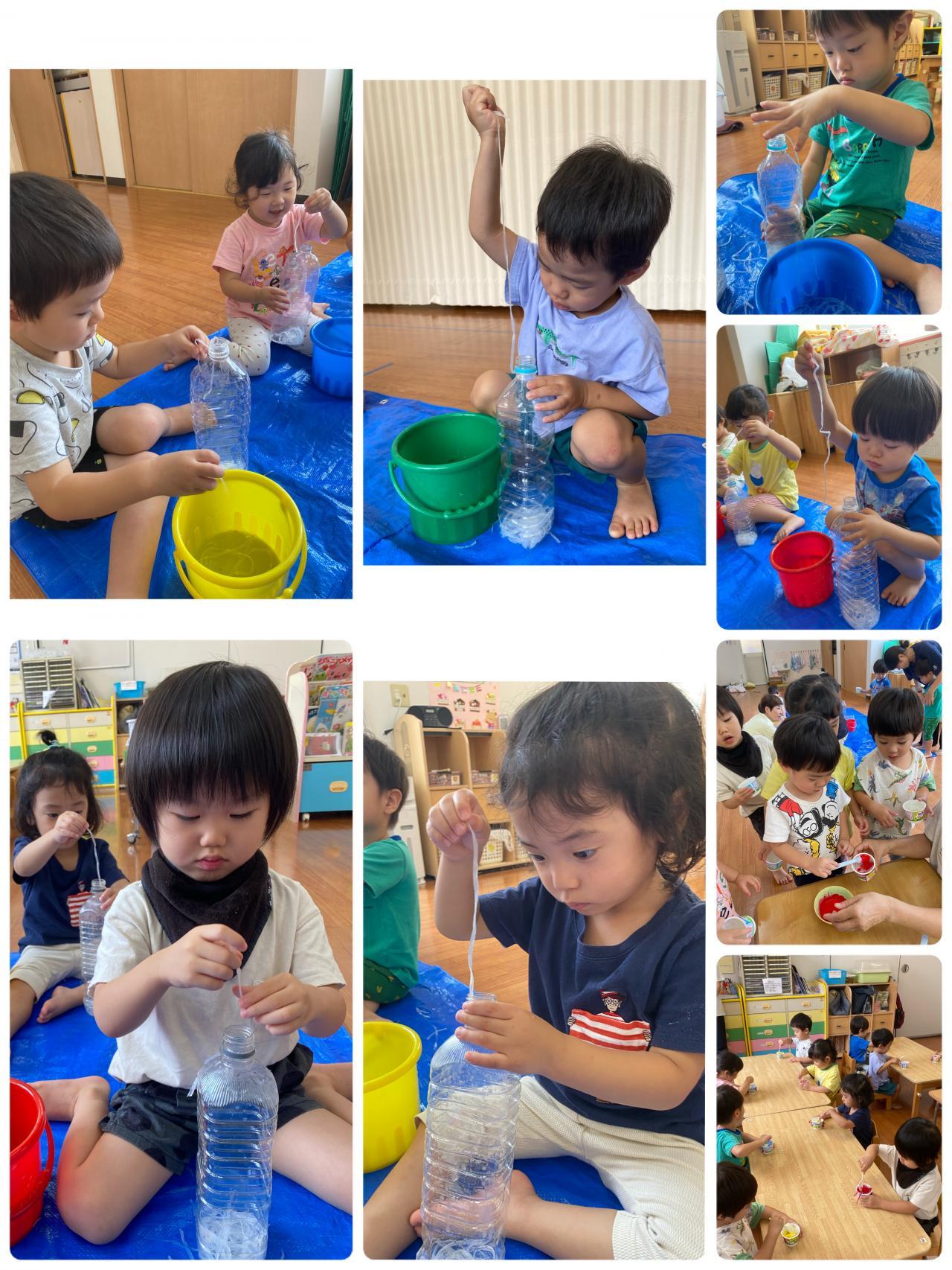 春雨で遊んだよ~!「いれるのむずかしいよぉ~」「いっぱいはいったよ~」