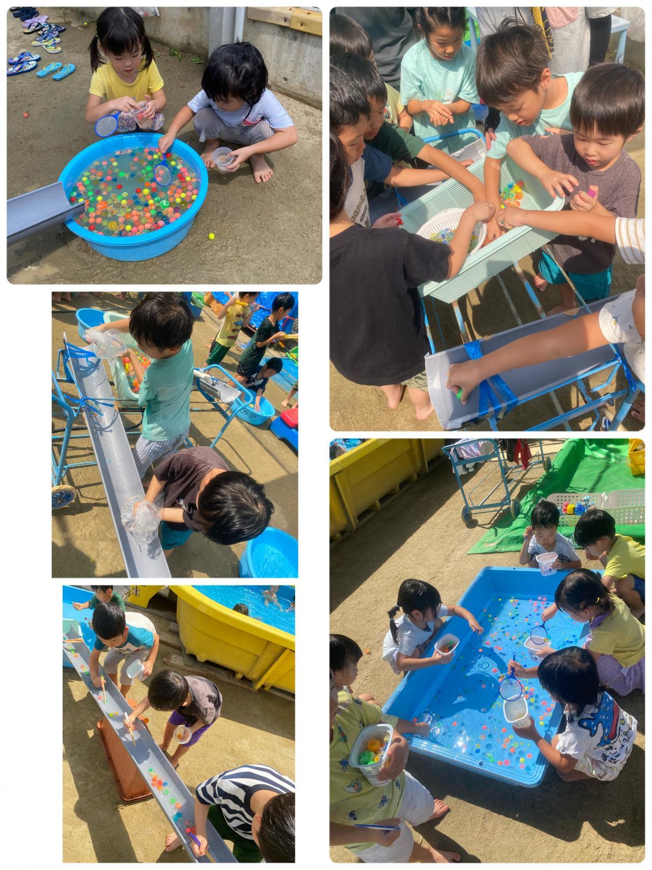 「とれたよ~」「こんないっぱい~」「つるつるしてるのむずかしいよ~」「え~!スーパーボールもながれてきたよ~!」