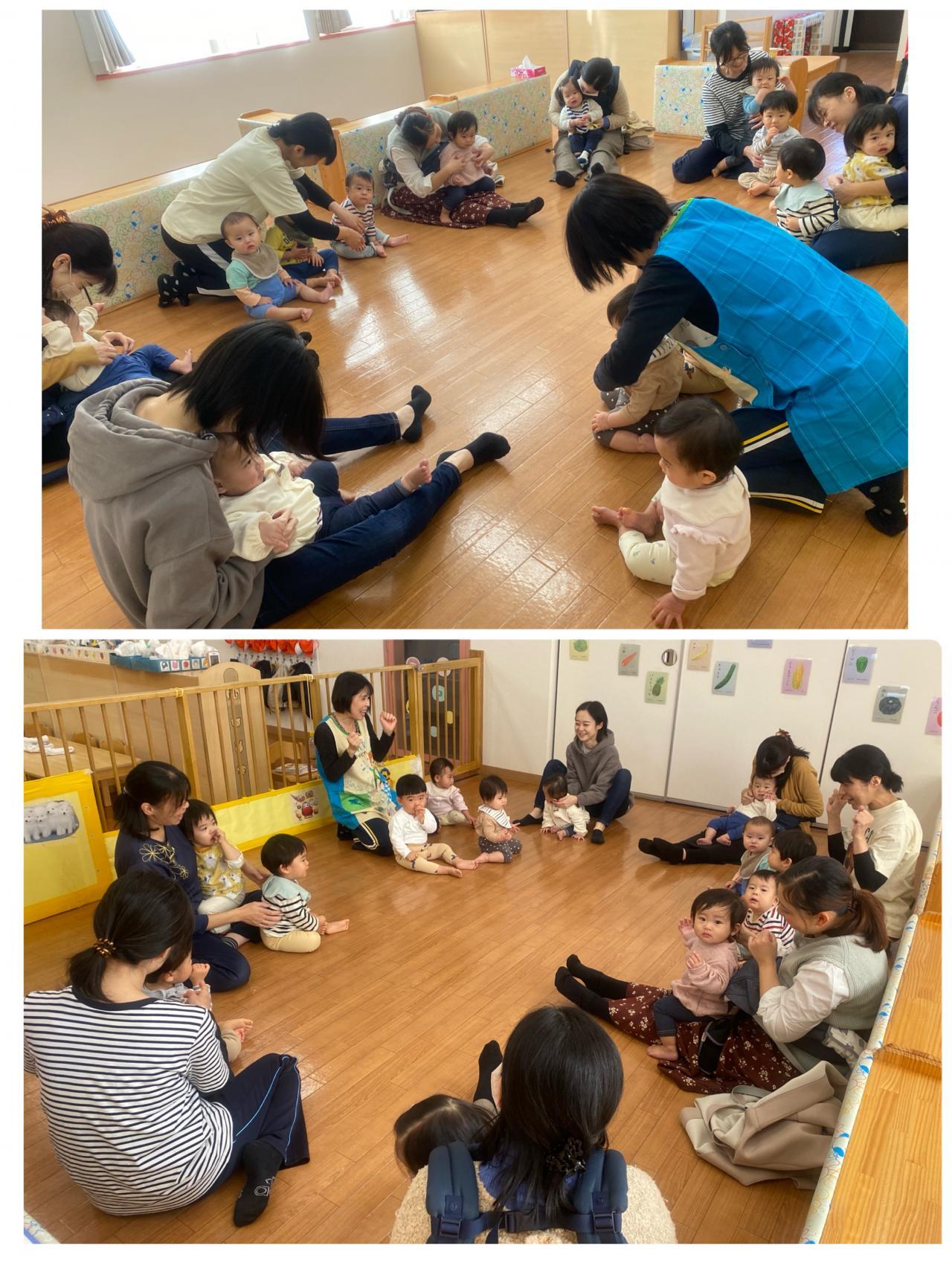 毎月の「絵本の読み聞かせ」に、地域交流として近くのお友だちも参加していただいています。0歳児では4組のお友だちが来てくれました。絵本の後はクラスのお友だちと一緒に遊んだよ。また来てね~~~!!!