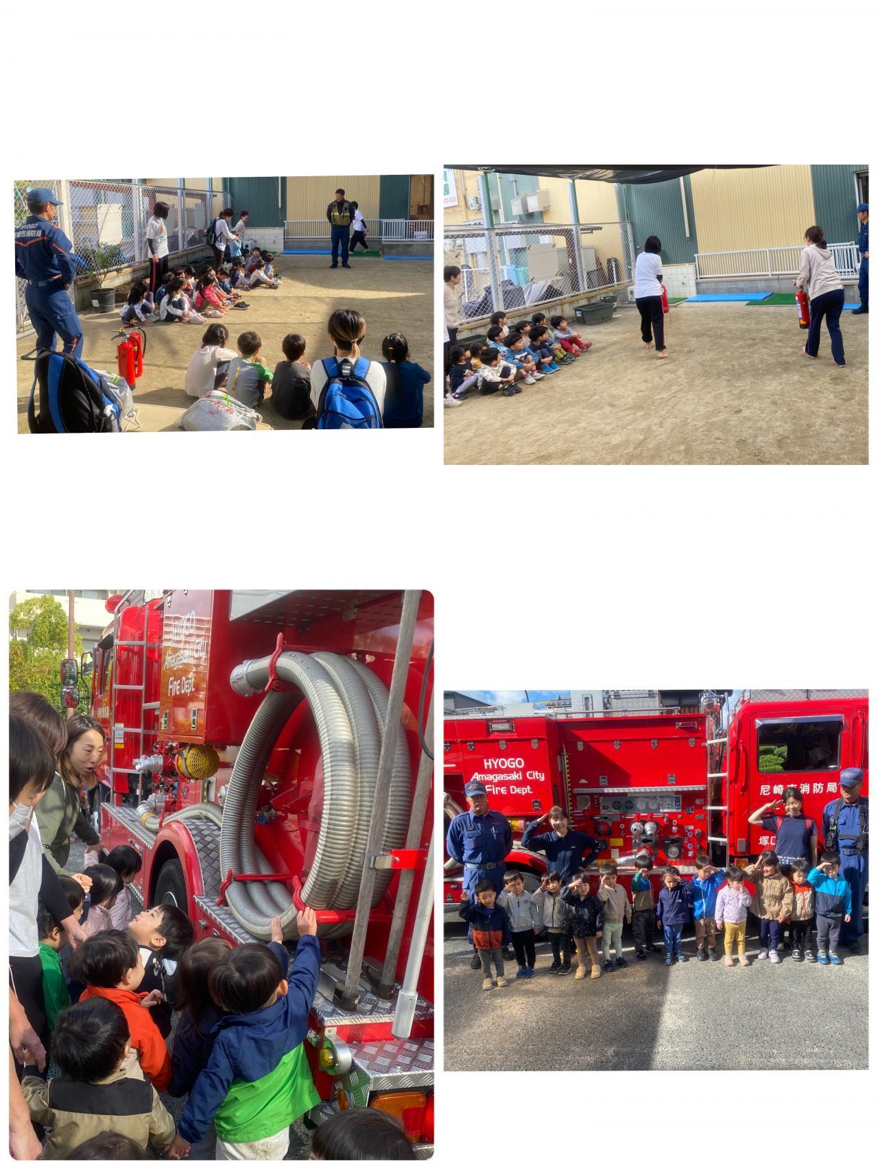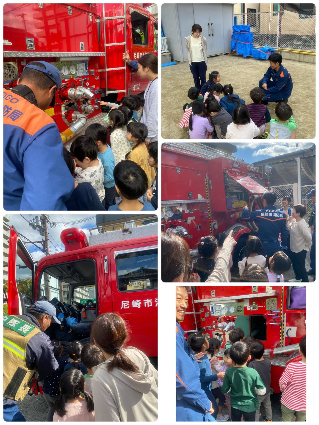 実際の消防車と消防士さんを見てみんなキラキラ。「おっきい消防車!!!」「ねぇ~この中になにが入っているの~~?」「運転席はどうなっているの~?」