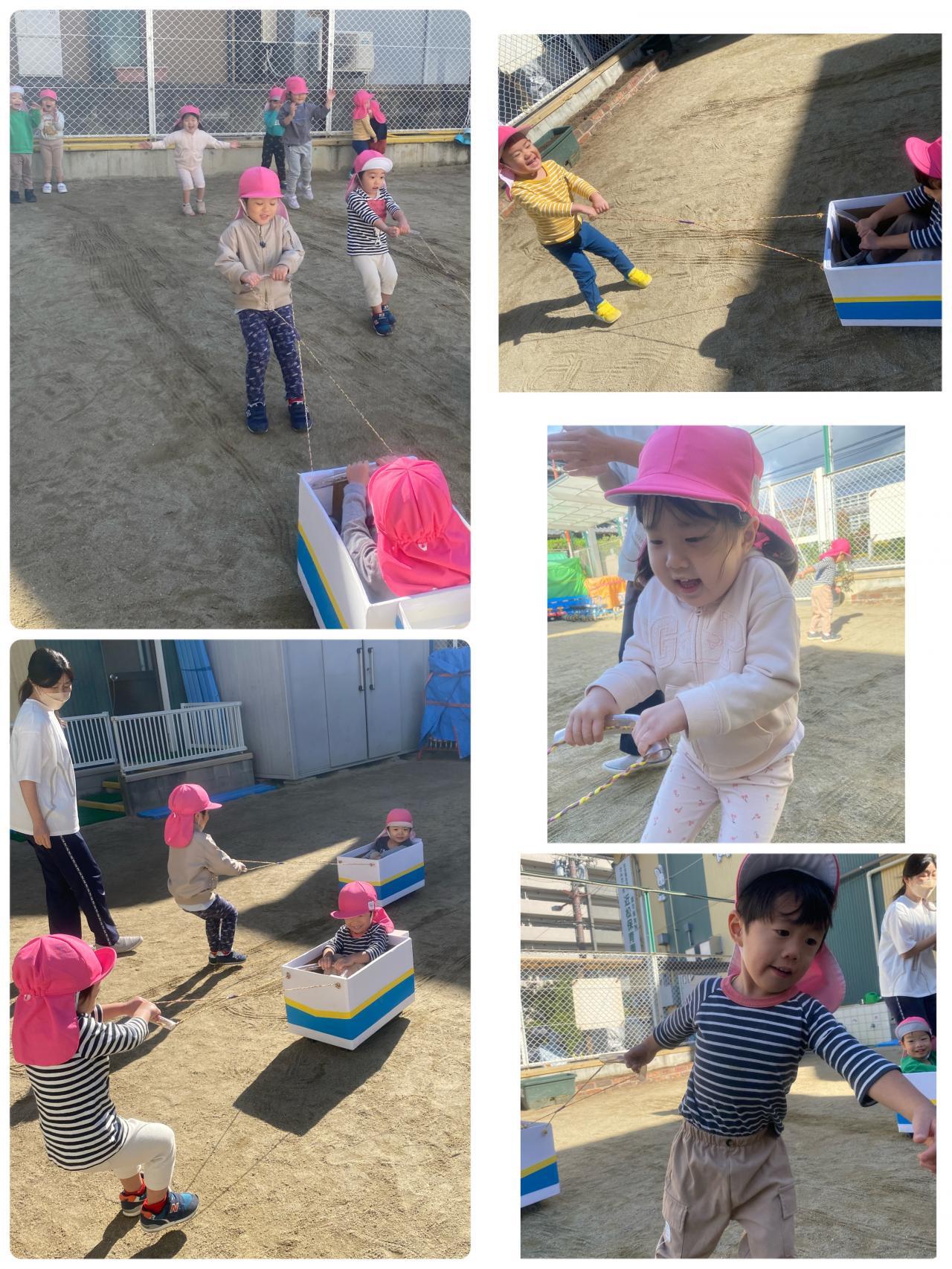 園庭でも元気いっぱい。「これうんどうかいでつかったね~」「よいしょ~!!」
