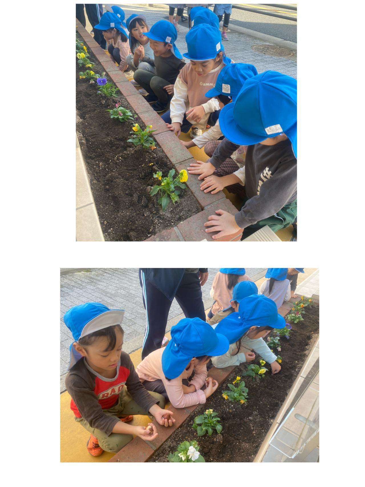 ▷らいおん組さんがチューリップの球根を植えてくれたよ~。きれいなお花が咲くころはみんなピカピカの1年生だね。「1年生になって見に来るよ~」