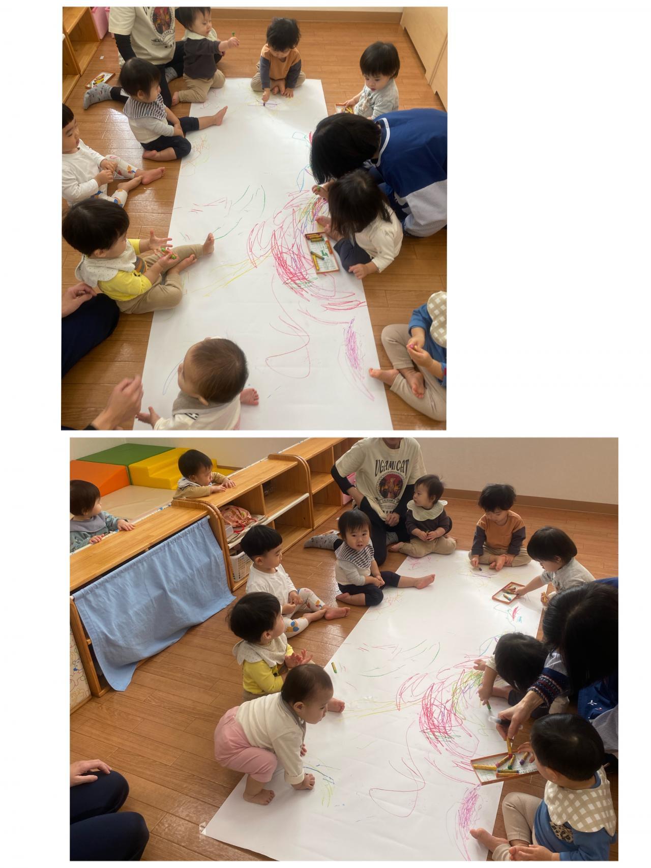 さて、ひよこ組(0歳児)、なぐり書きであそんでいます。ぐるぐるとっても上手になりました。「ぼくたちみてるよ~」とちいさいお友だちがじーっと様子をながめる姿も可愛いですね。