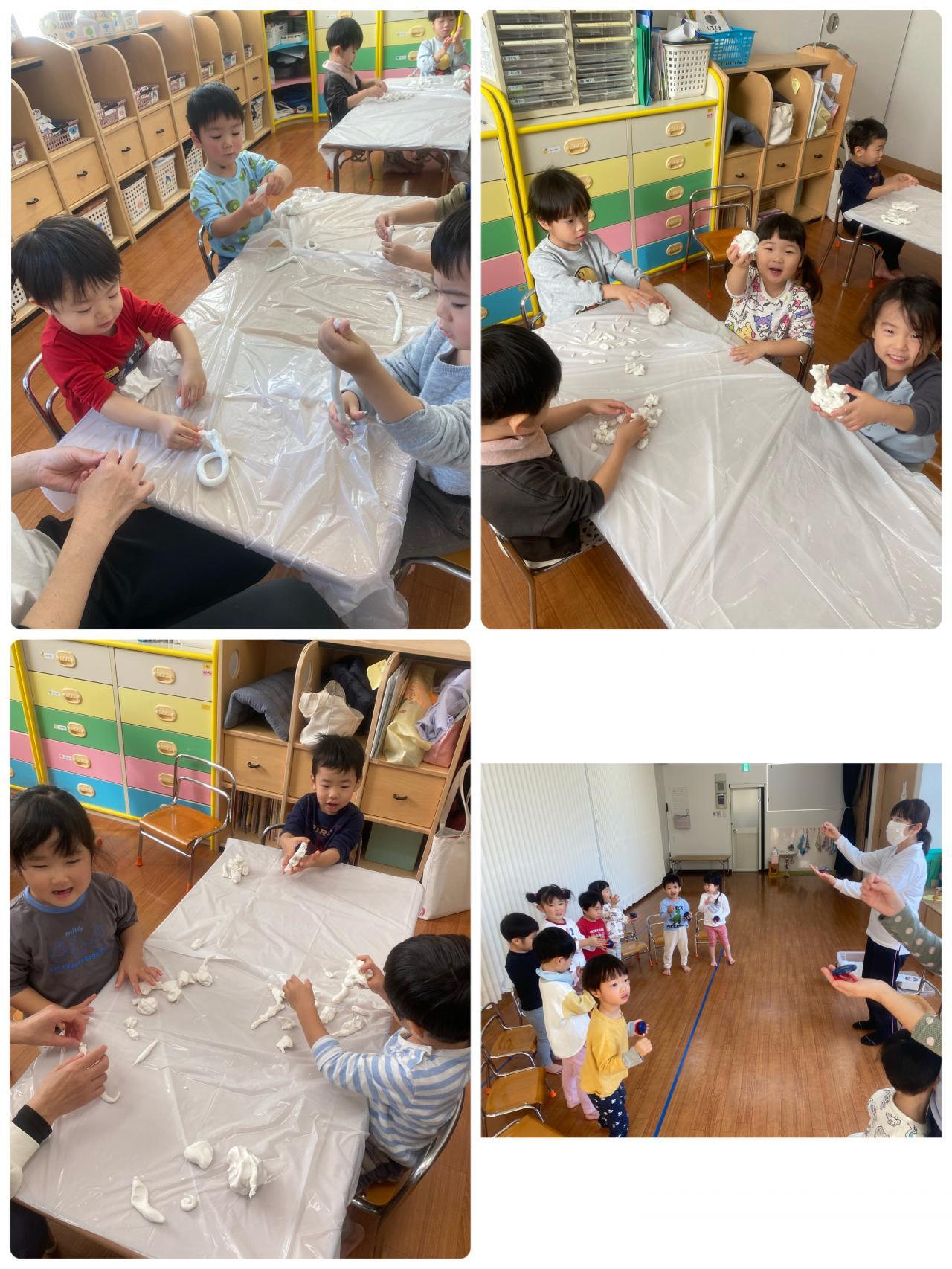 こちらはうさぎ組(2歳児)、紙ねんどであそんでいます。