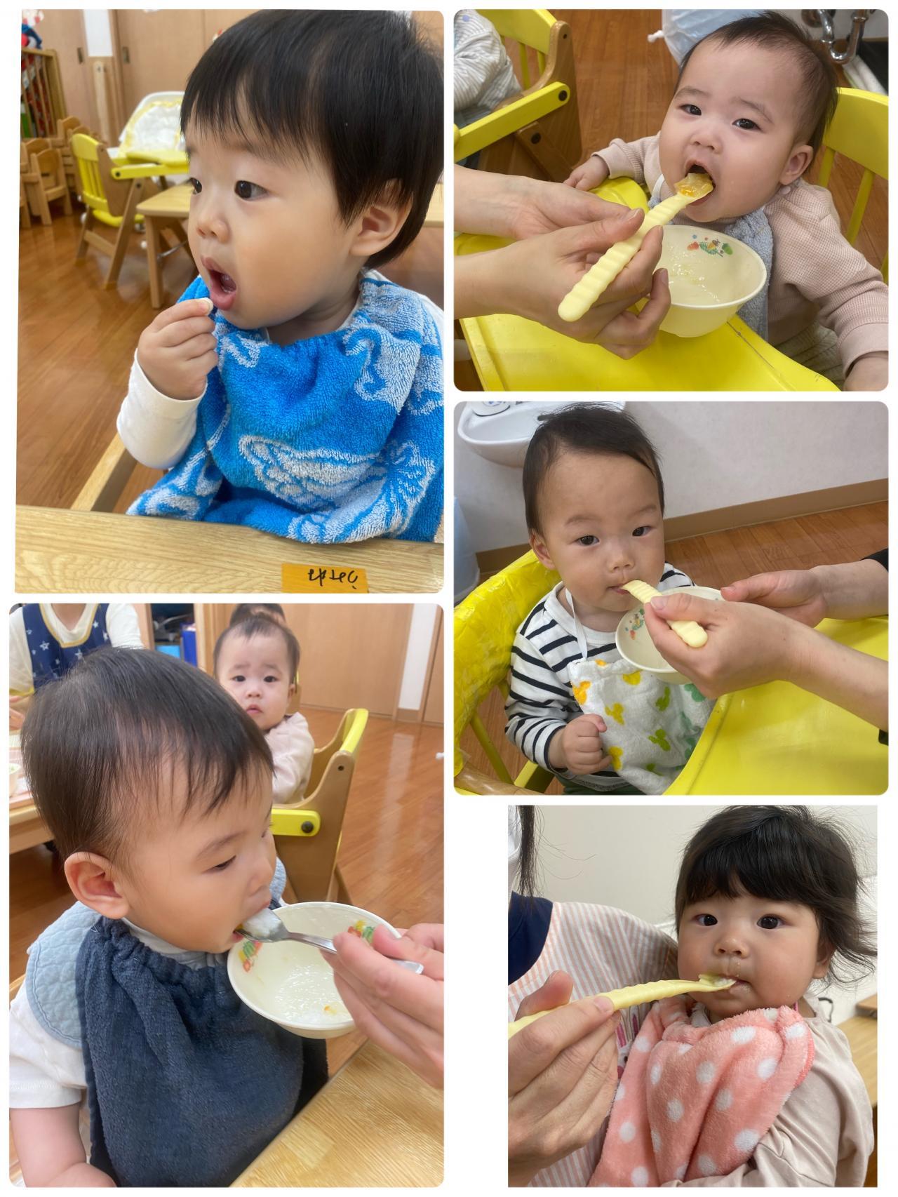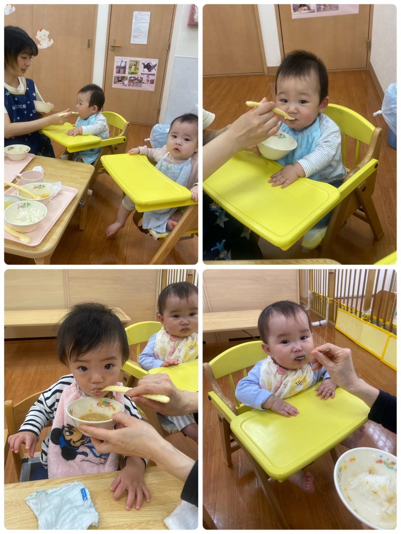 入園当初は泣く姿もありましたが、日に日に保育園に慣れてきたようです。「たのしくなってきたよ~!」「ごはんもおいしいねぇ~。」「あ~ん!」「ぱくっ」