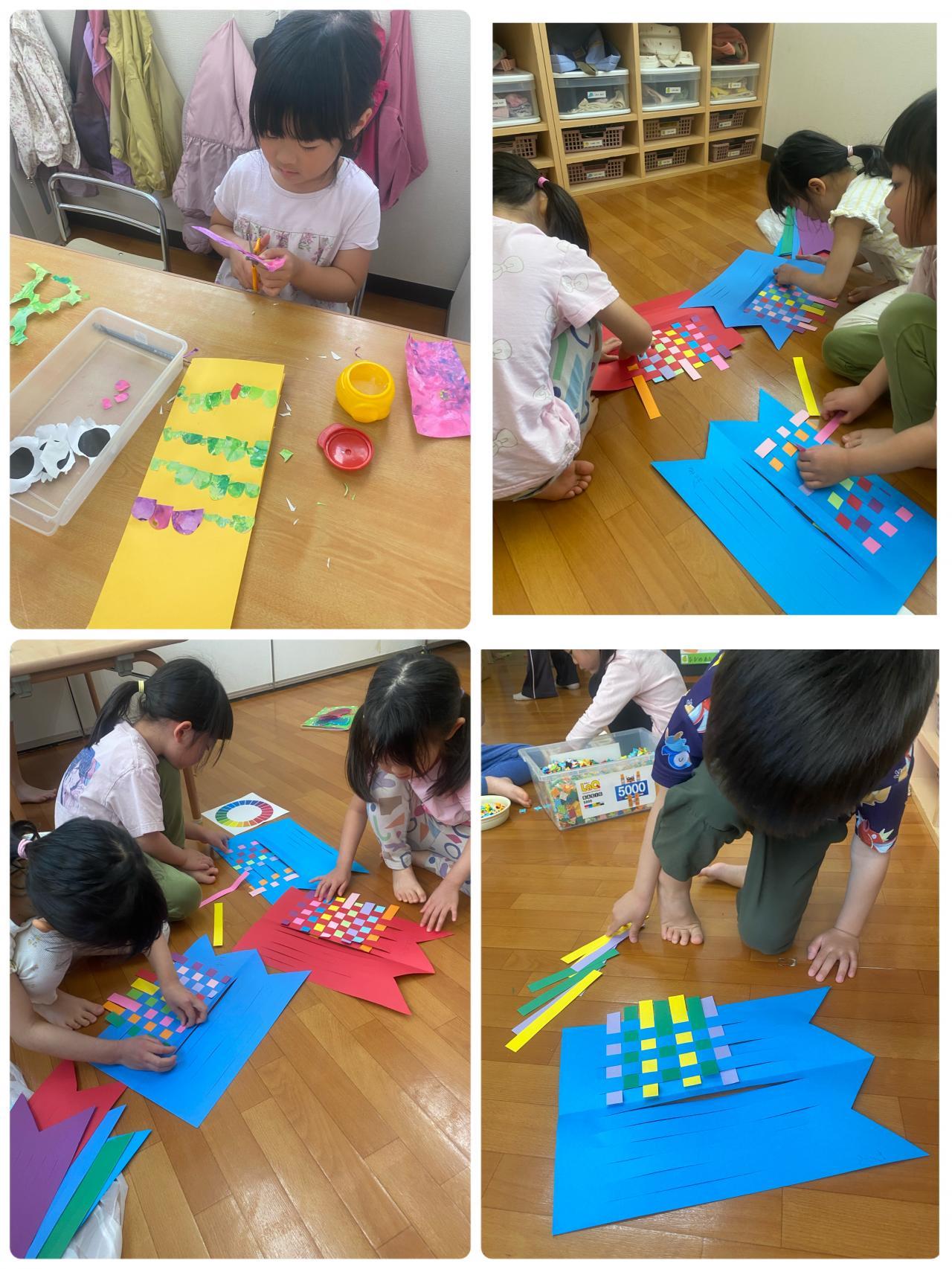 「うろこ、きれい~!たくさんつけて~カラフル!」「あみこみむずかしいねぇ~」