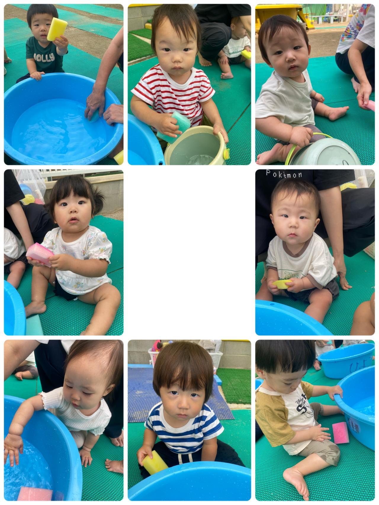 スポンジの感触あそびをしたよ~。 傾けたり、ぎゅっとにぎると水がでてくる様子に、興味を持ってぎゅっとしてみるひよこちゃん達です。