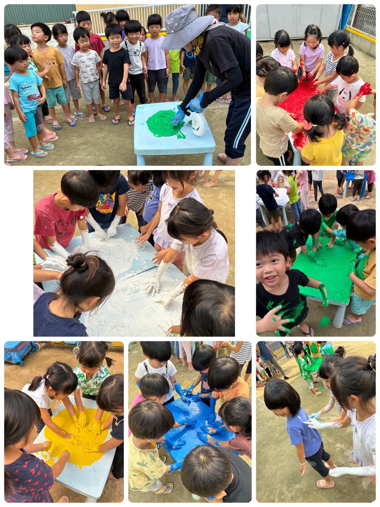 「ぼくあかであそぶ~!」「わたしはしろ~!」「いっしょにいこ~」「ぬるぬるするね~」「うでにもふくにもつけちゃお~」