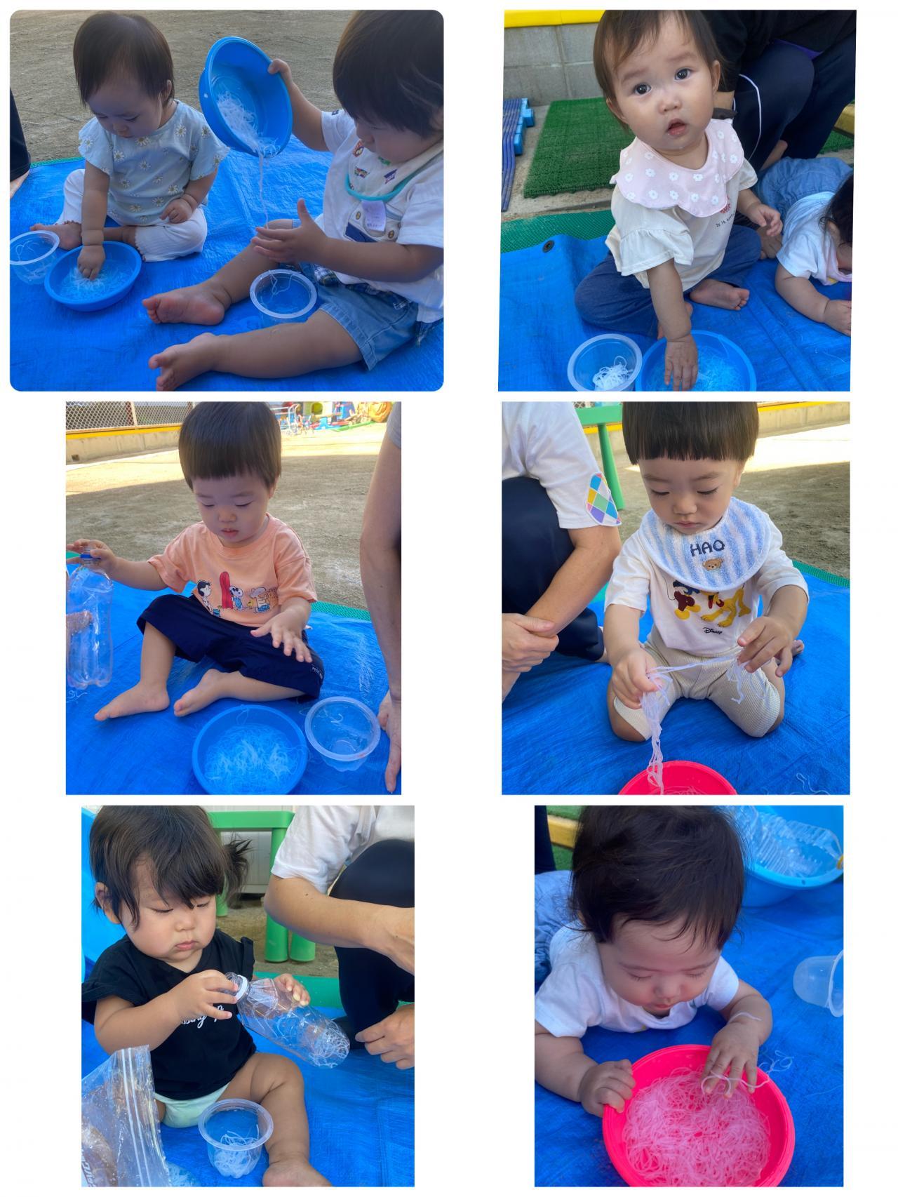 糸こんにゃくであそんだよ~!「つるつるしているねぇ~」「つまめるかなぁ~」