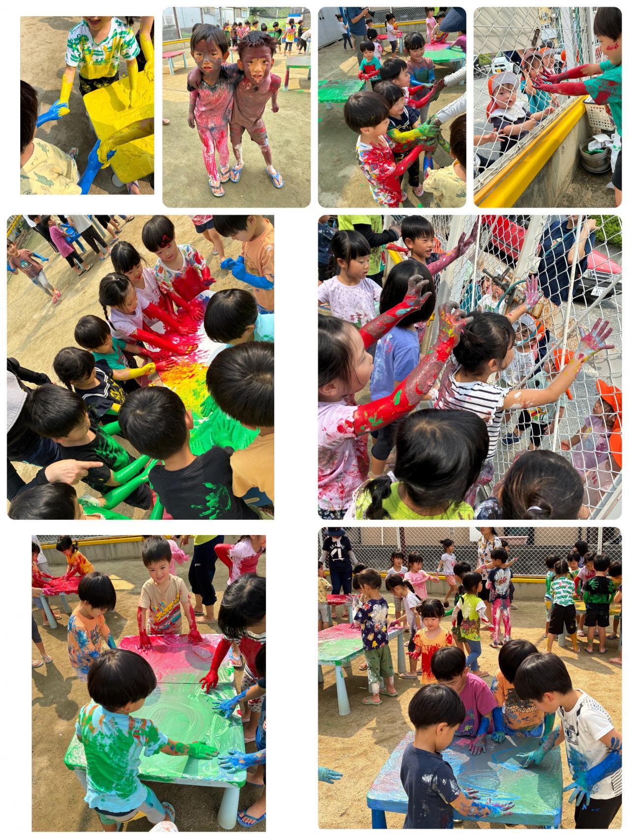 毎年恒例のボディペインティングです。絵の具の感触をたのしみながら大胆にあそびました。