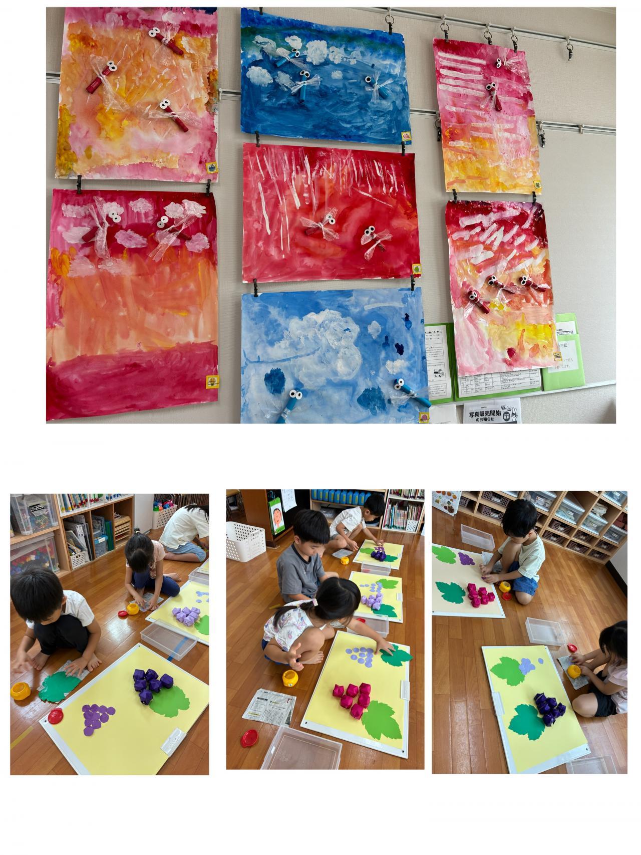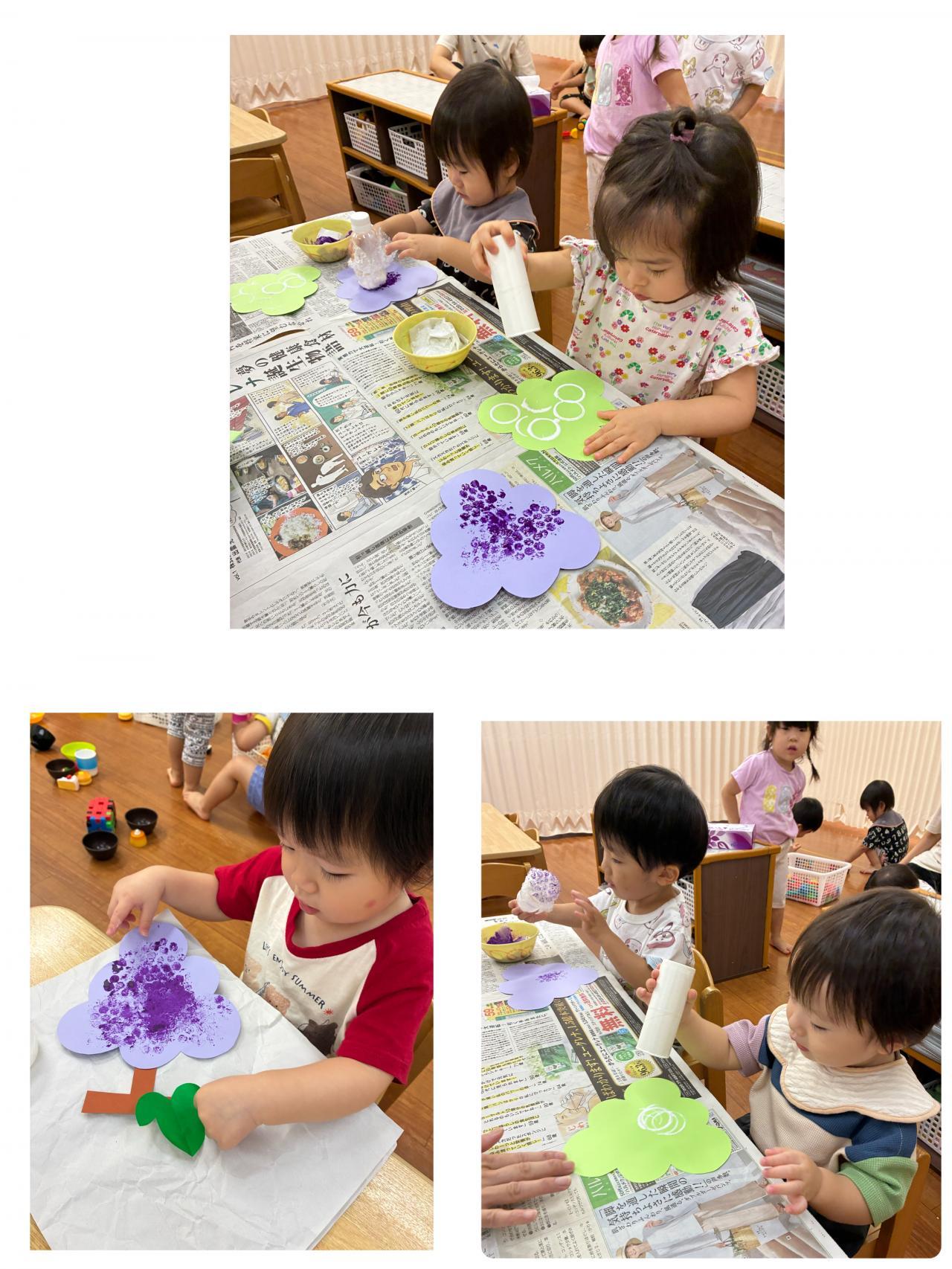 室内ではぶどうの製作をしたよ~。「ぎゅ~ぽんっ!」「こっちはぽんぽん!!」