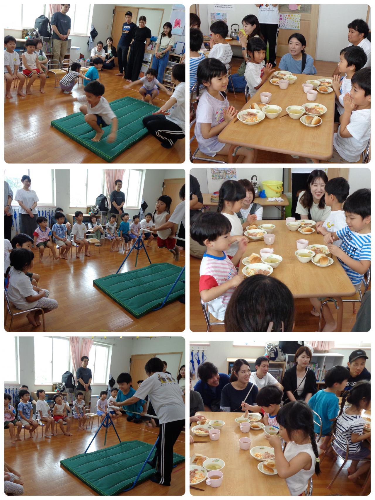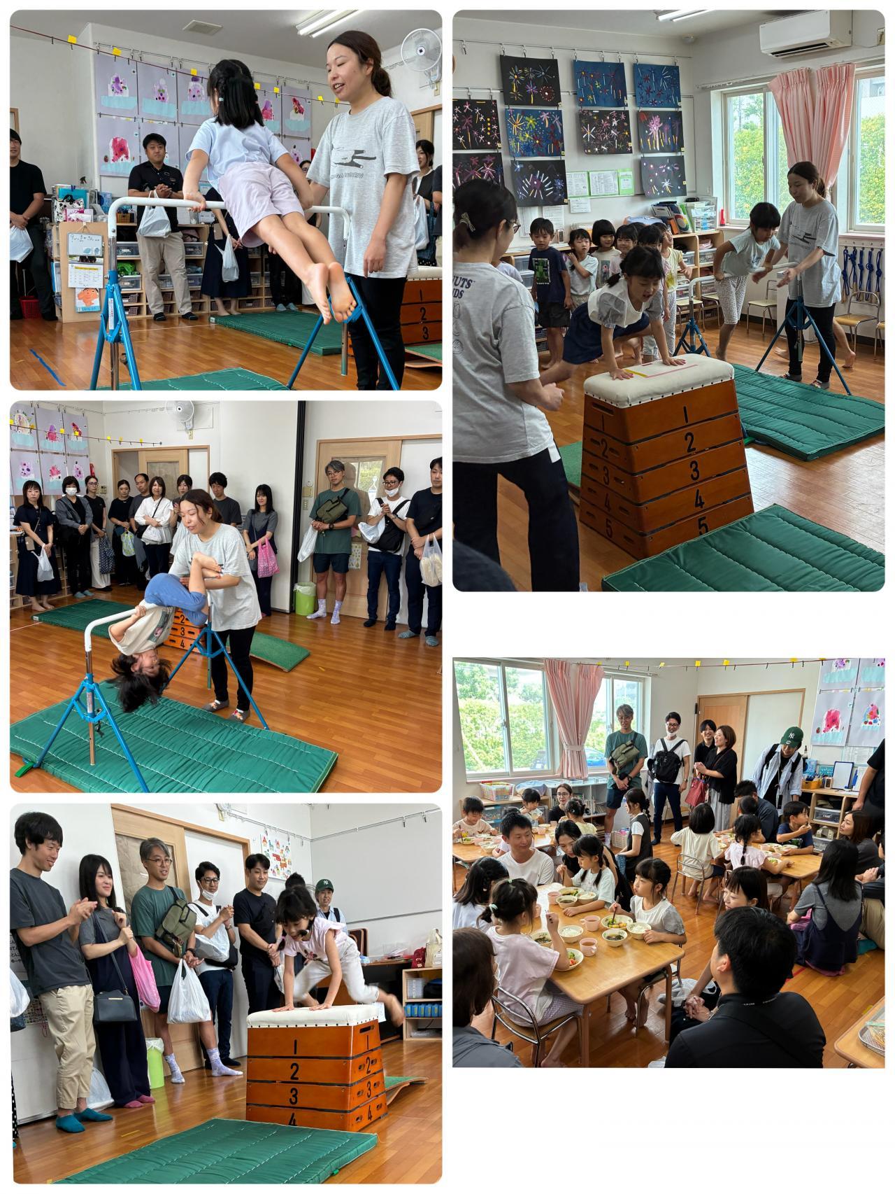 室内あそびとお給食を参観してもらいました。昨年よりも大きく成長した姿を見てもらい、ちょっぴり緊張しながらも子どもたちは張り切っていました。