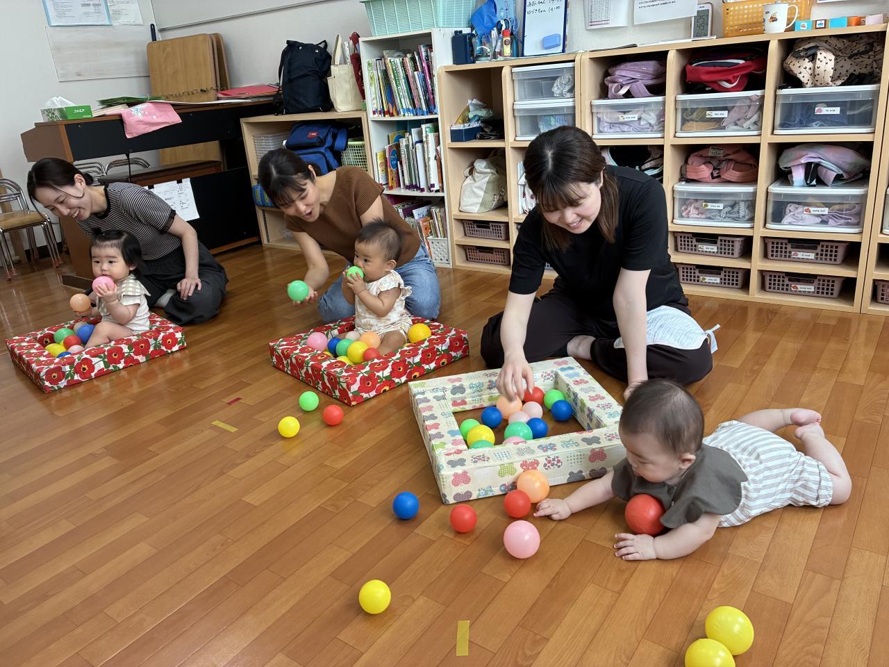 9月の絵本の読み聞かせが急遽延期になったので、地域交流で園にあそびにきてくれたお友だちと手あそびしたりボールであそんだり楽しい時間を過ごしました。お誕生日が一緒の子がいて、ママ同士も話が弾みます♪