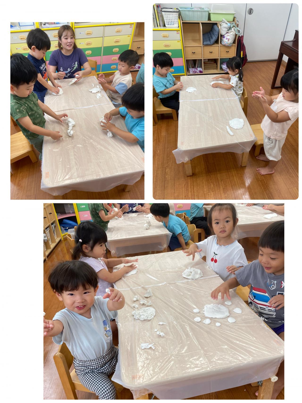 単色であそんだあとは、他の机に移動して色の混ざり具合も楽しみます。どんどん大胆になってきました。お散歩から帰ってきたりす組さんもびっくり!!