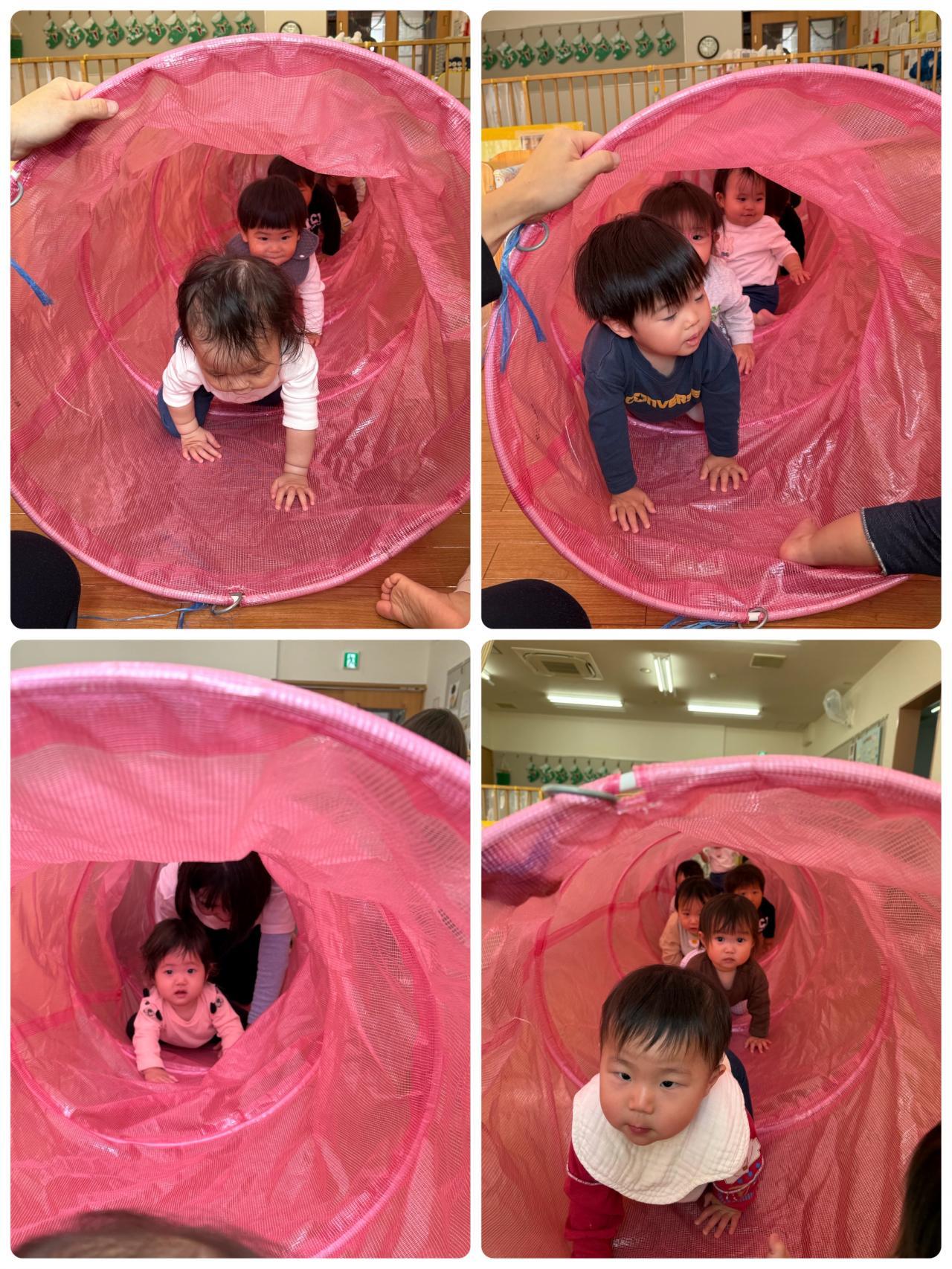 室内ではトンネルくぐりをしてます。「まてまて~」「もうすぐゴール!!」