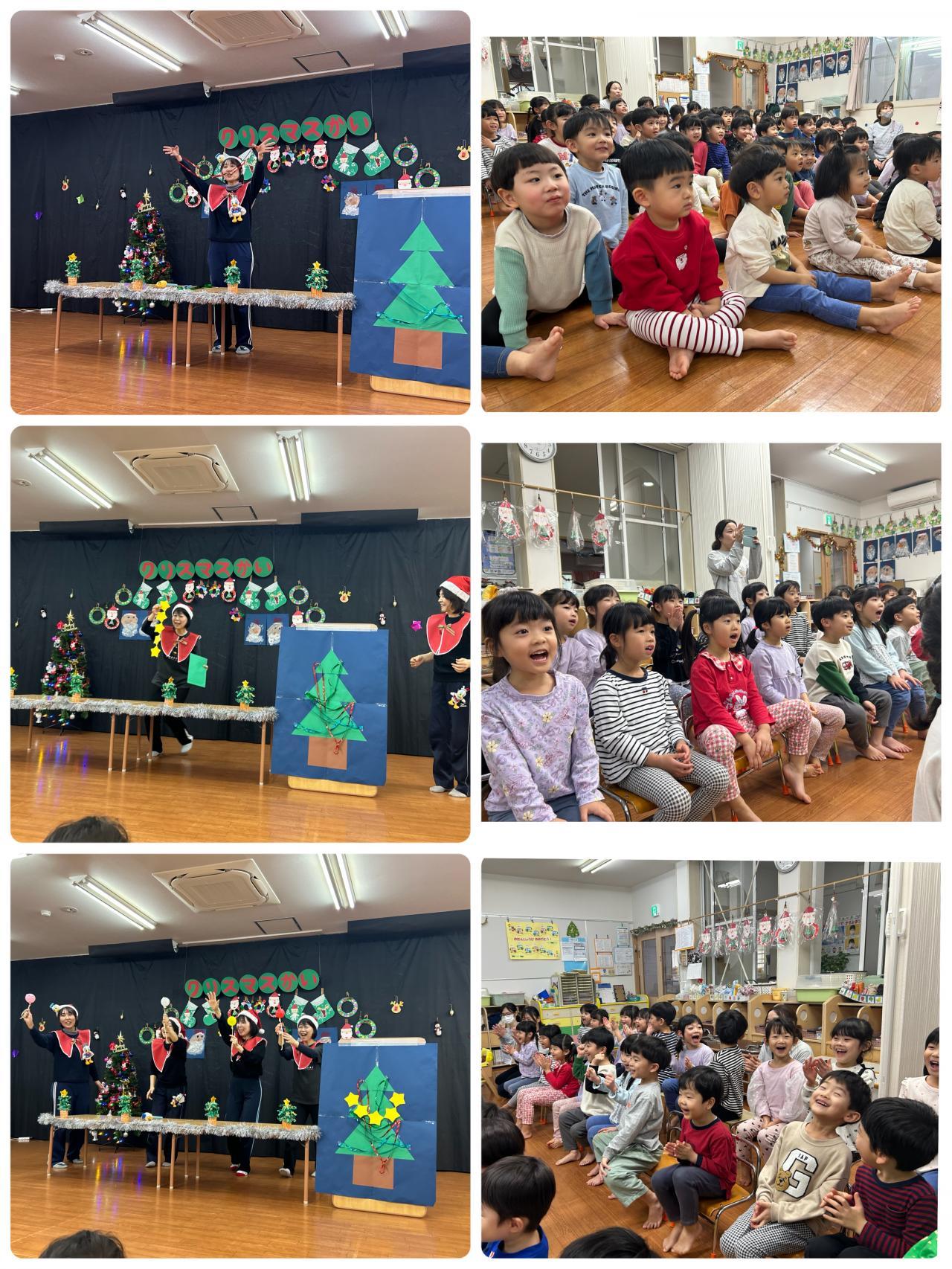 保育者がツリーの飾りを手品で出してくれました!どんどん出てきます!あれれしぼんだ風船が大きくなった!「なんで~~??」「すごい~~!!」