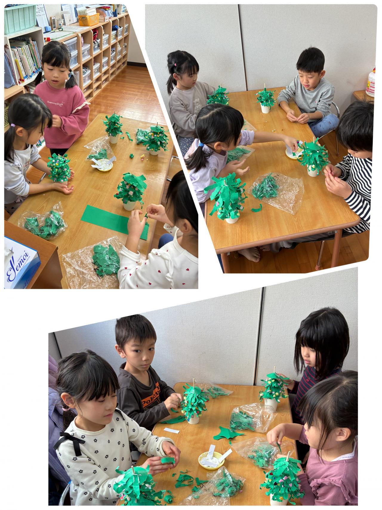 クリスマス製作をしたよ。「キラキラいっぱいつけよ~!」「ボンドつけるのむずかしいね~」