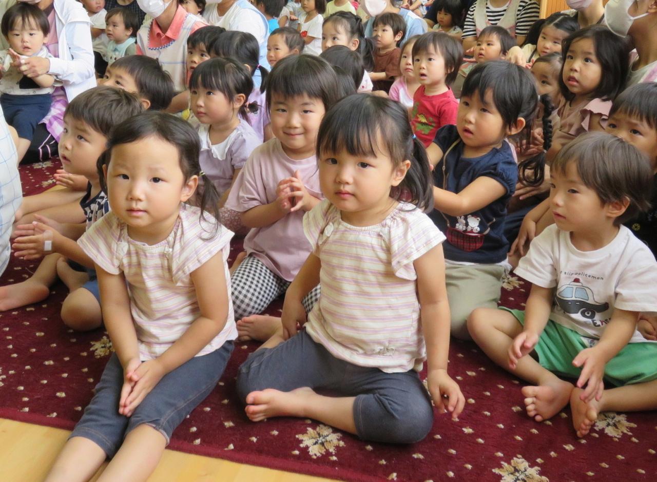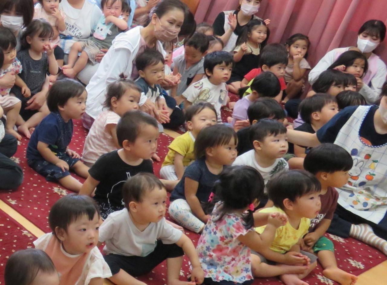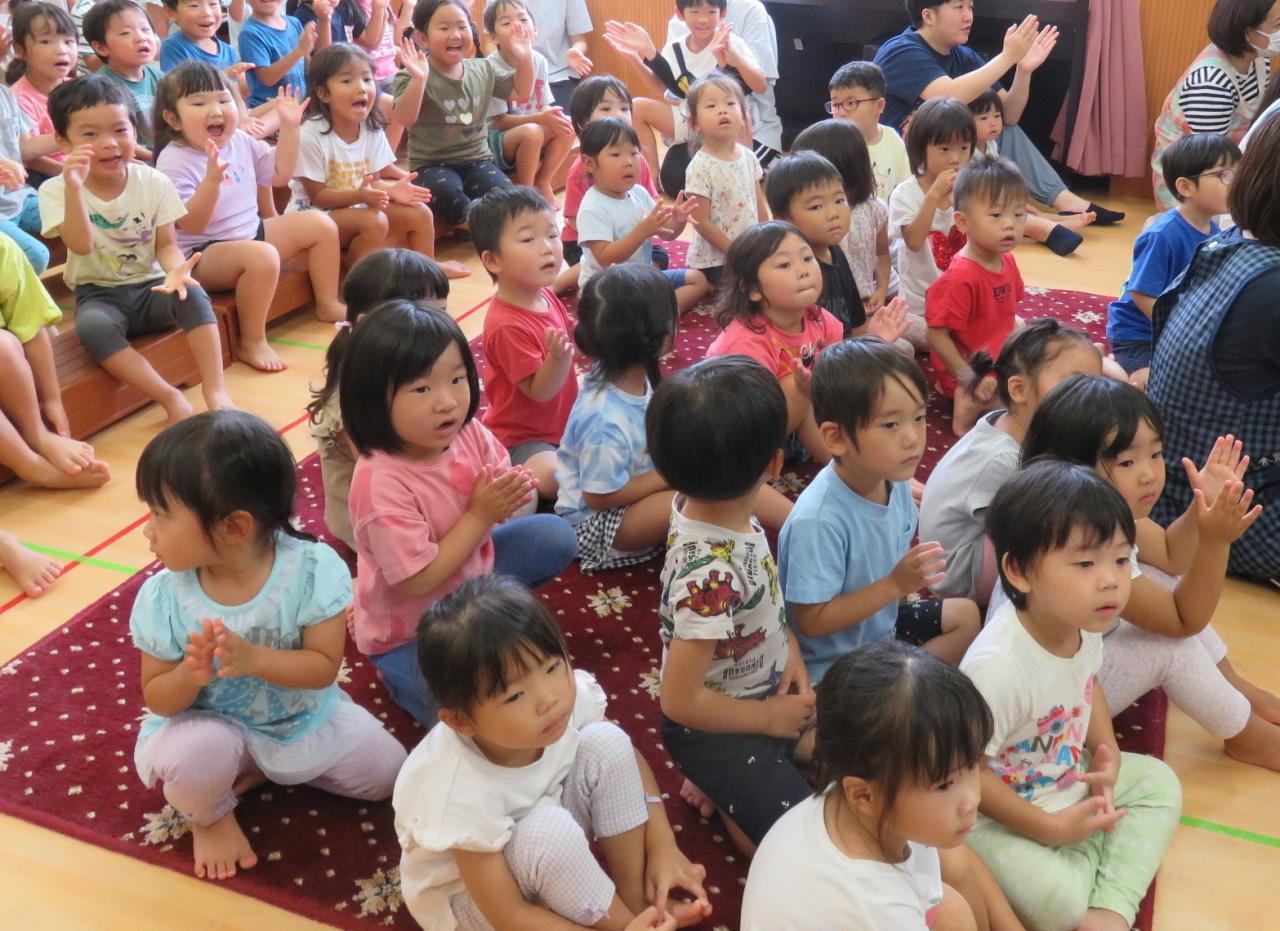 みんなが知っているトトロの「さんぽ」から始まり、「かたつむり」「うみ」「くじらのとけい」、パネルシアター「にじ」「あめふりりんちゃん」、