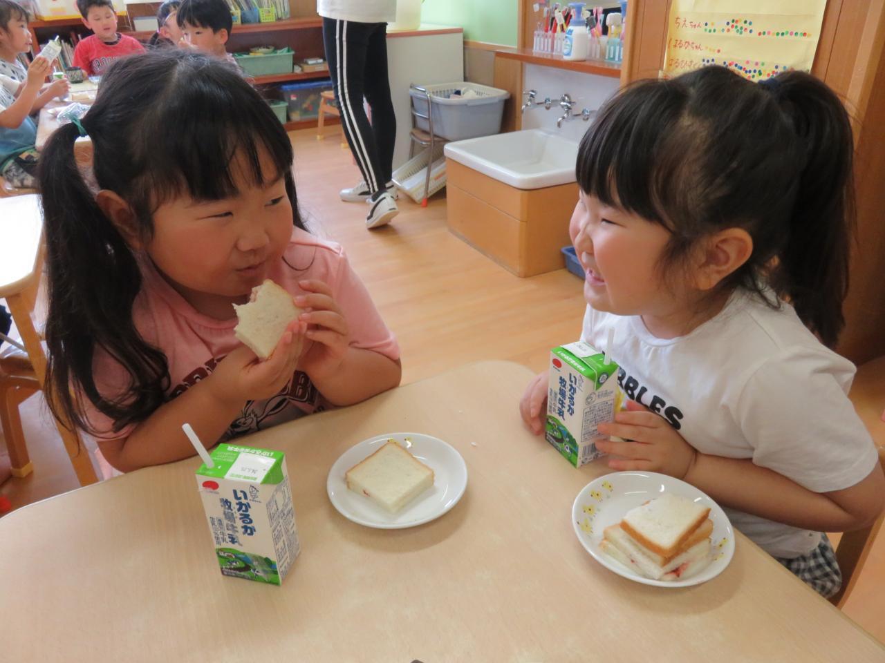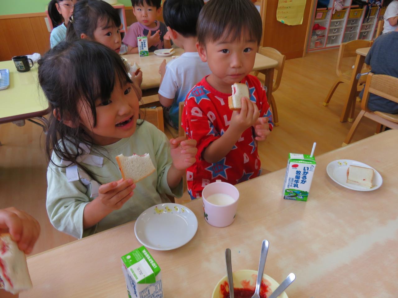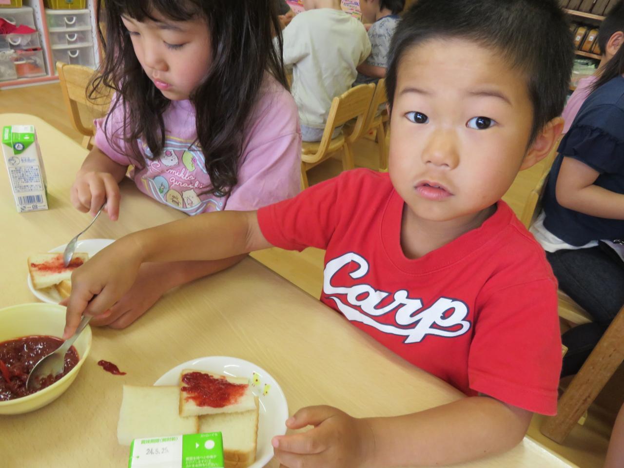 そしてお待ちかねのおやつの時間。器の中に真っ赤でキラキラしたジャムが入っているのを見て「できてる!」「おいしそう!」と大興奮。