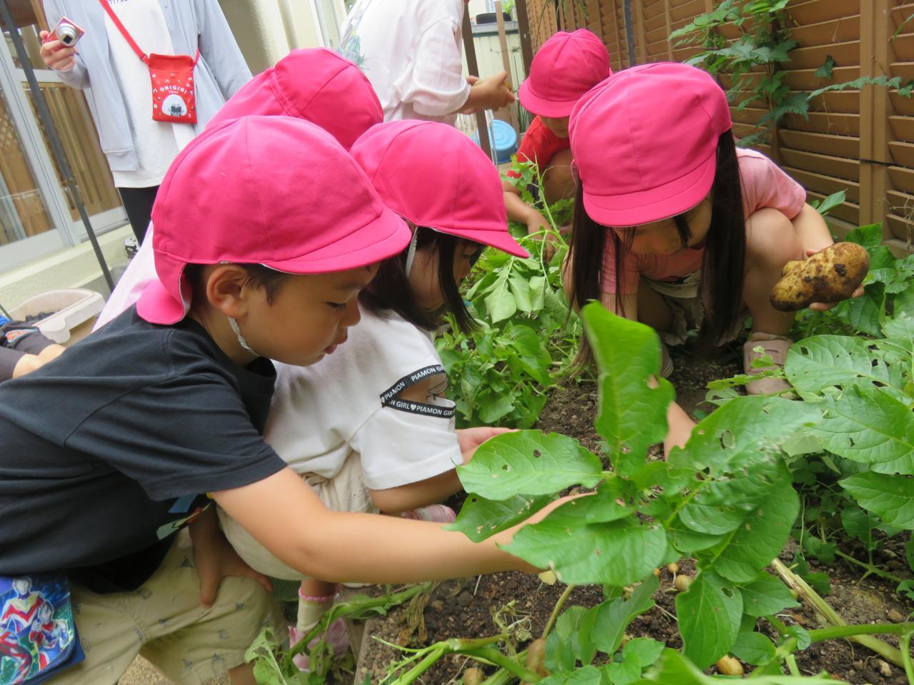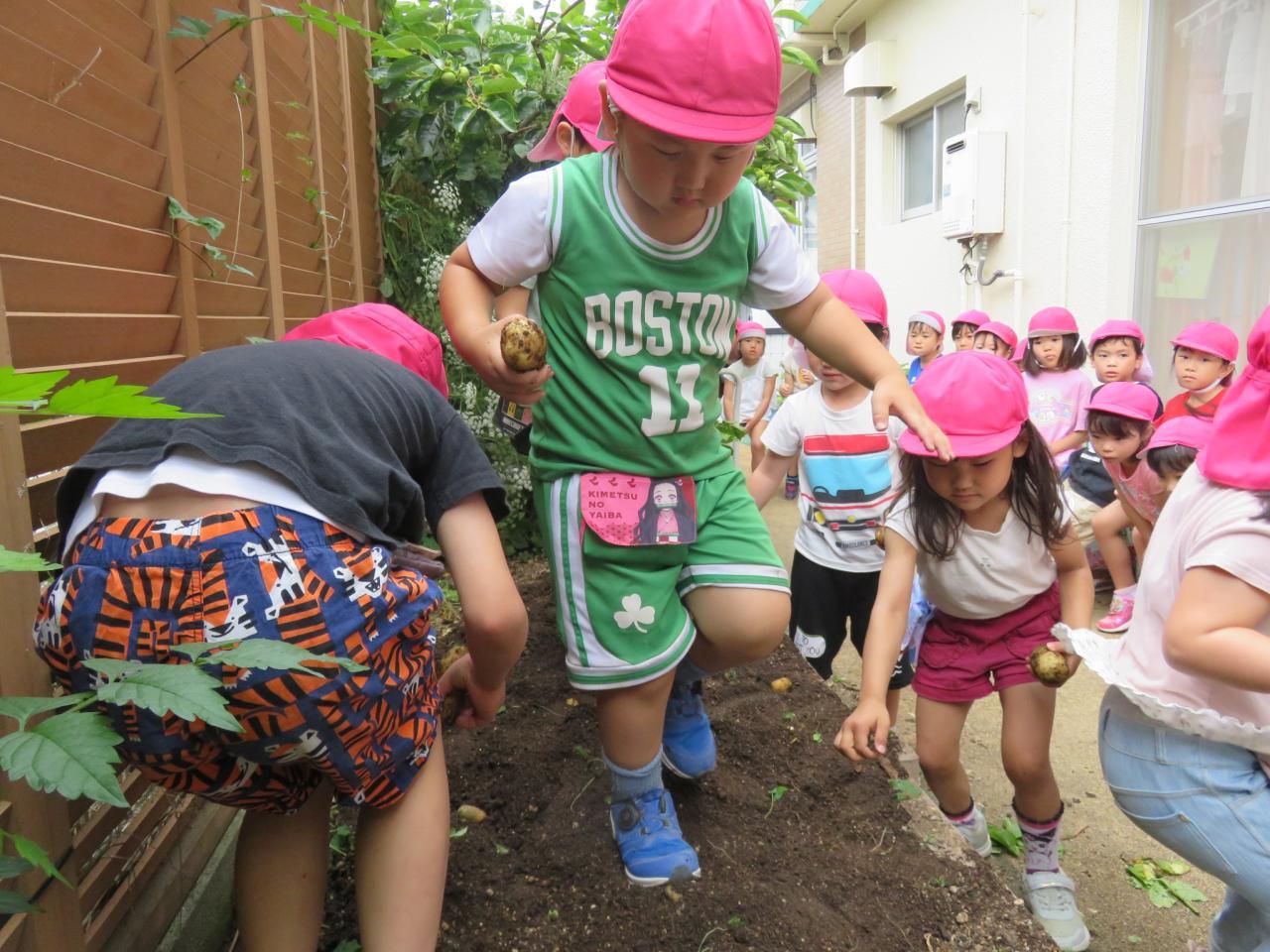 ぞう組さんが、2月に畑に植え付けたじゃがいもを収穫しました。