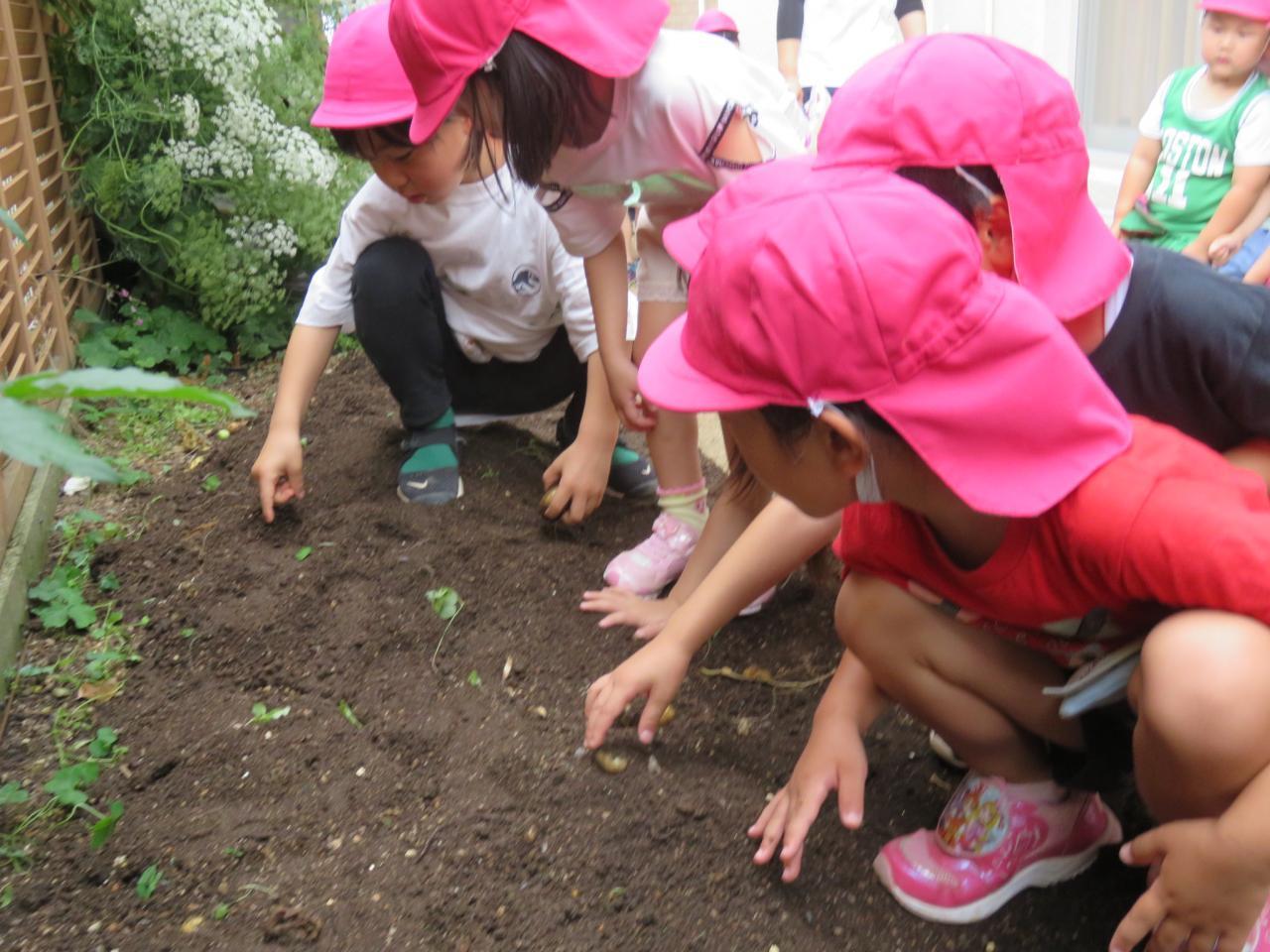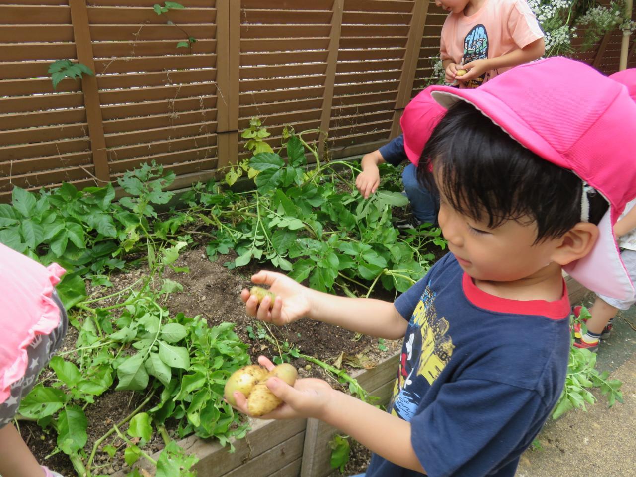 土を掘って手を真っ黒にしながら大きいのを探したり、「みて!スーパーでうってるのみたい!」ときれいな形のじゃがいもを見て満足そうにしてたり、小さいのを見つけて「かわいい!」と大切そうに手のひらにのせてみたり、土の中から出てくるダンゴムシやミミズたちを見て大興奮したり、虫たちを避けながらそっと指でじゃがいもをつまんだり、子どもたちはそれぞれの楽しみ方で、じゃがいもを収穫していました。