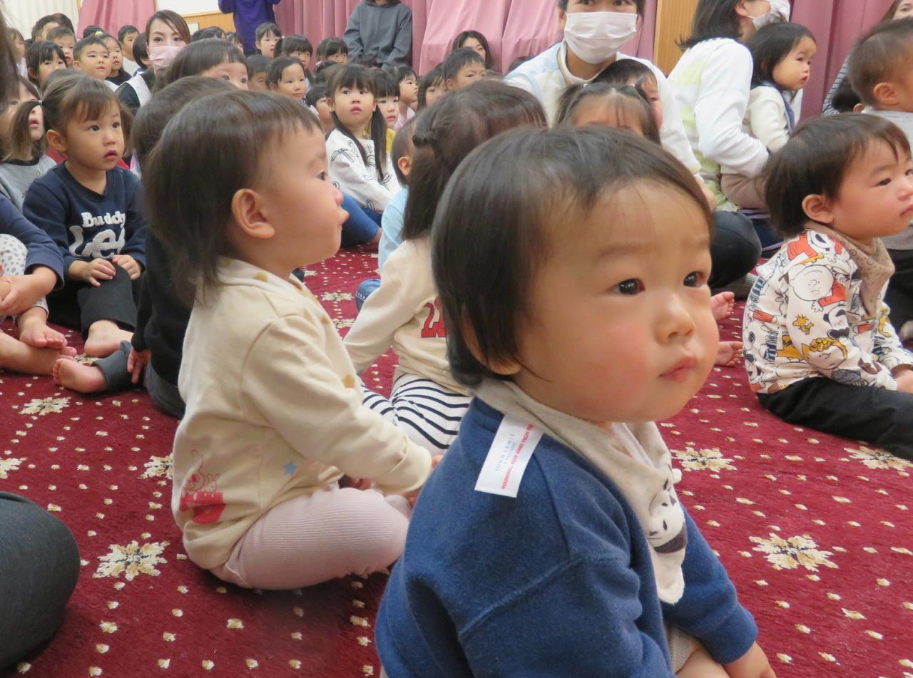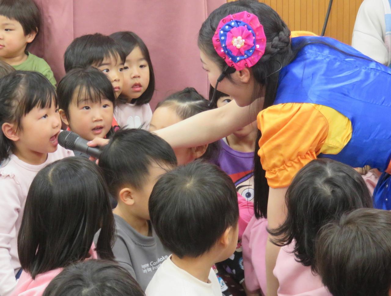 3人のおねえさんがマイクを子どもたちのところまで持ってきてくれて、一緒に歌うメドレー(♪ドレミのうたや♪森のくまさん等)、