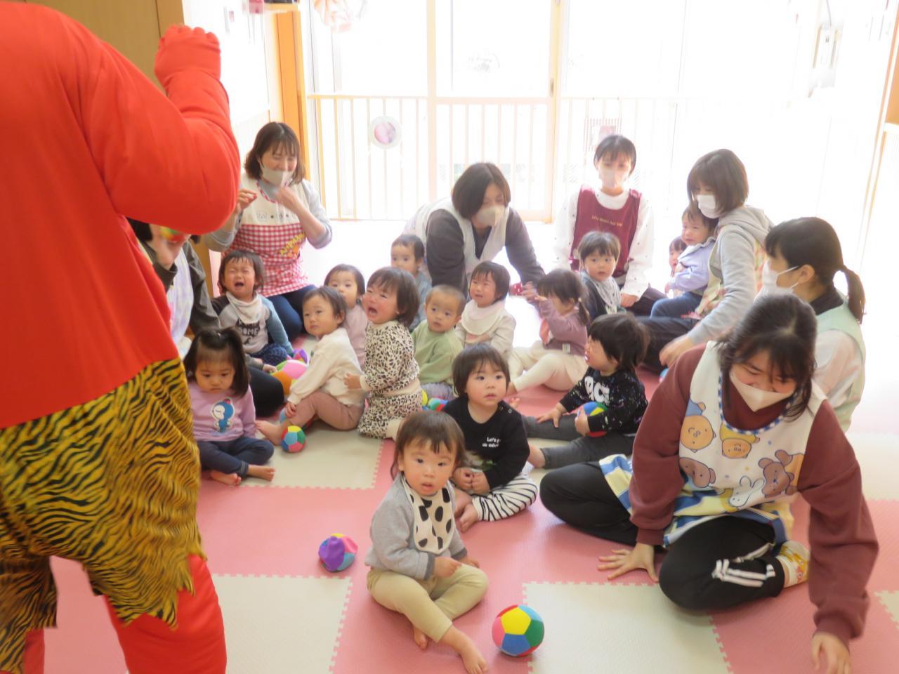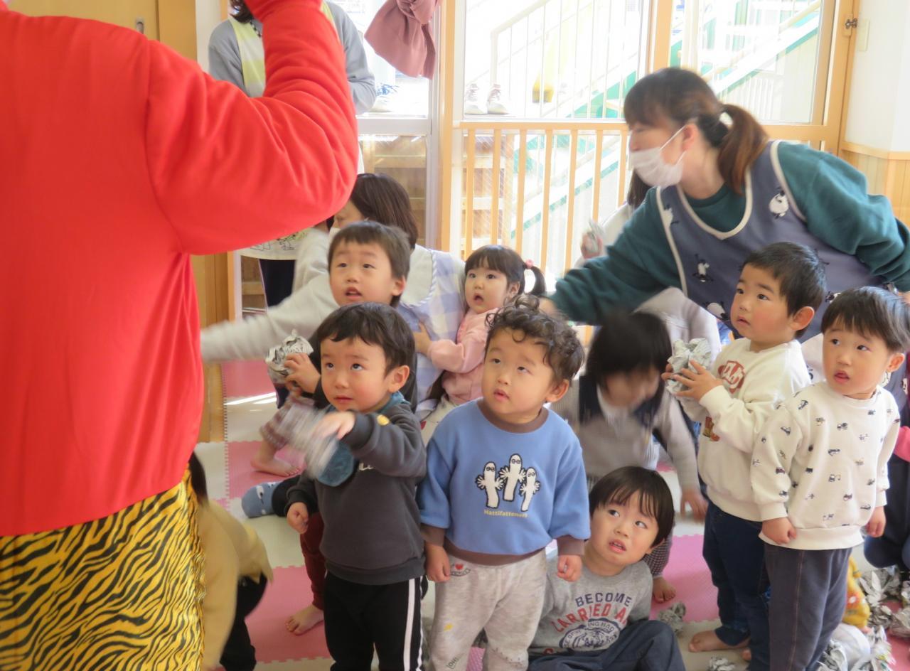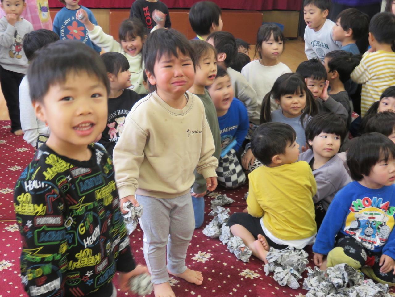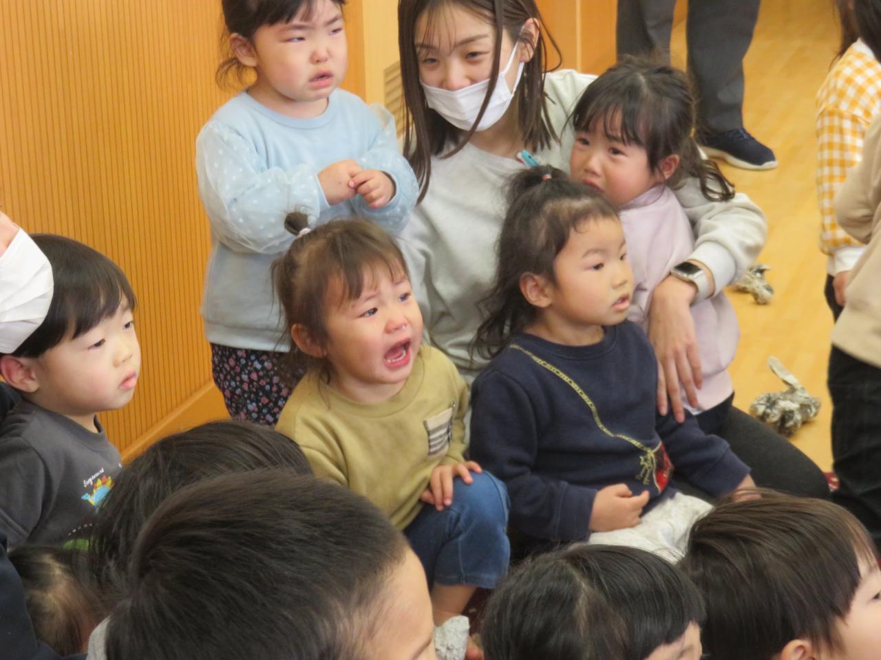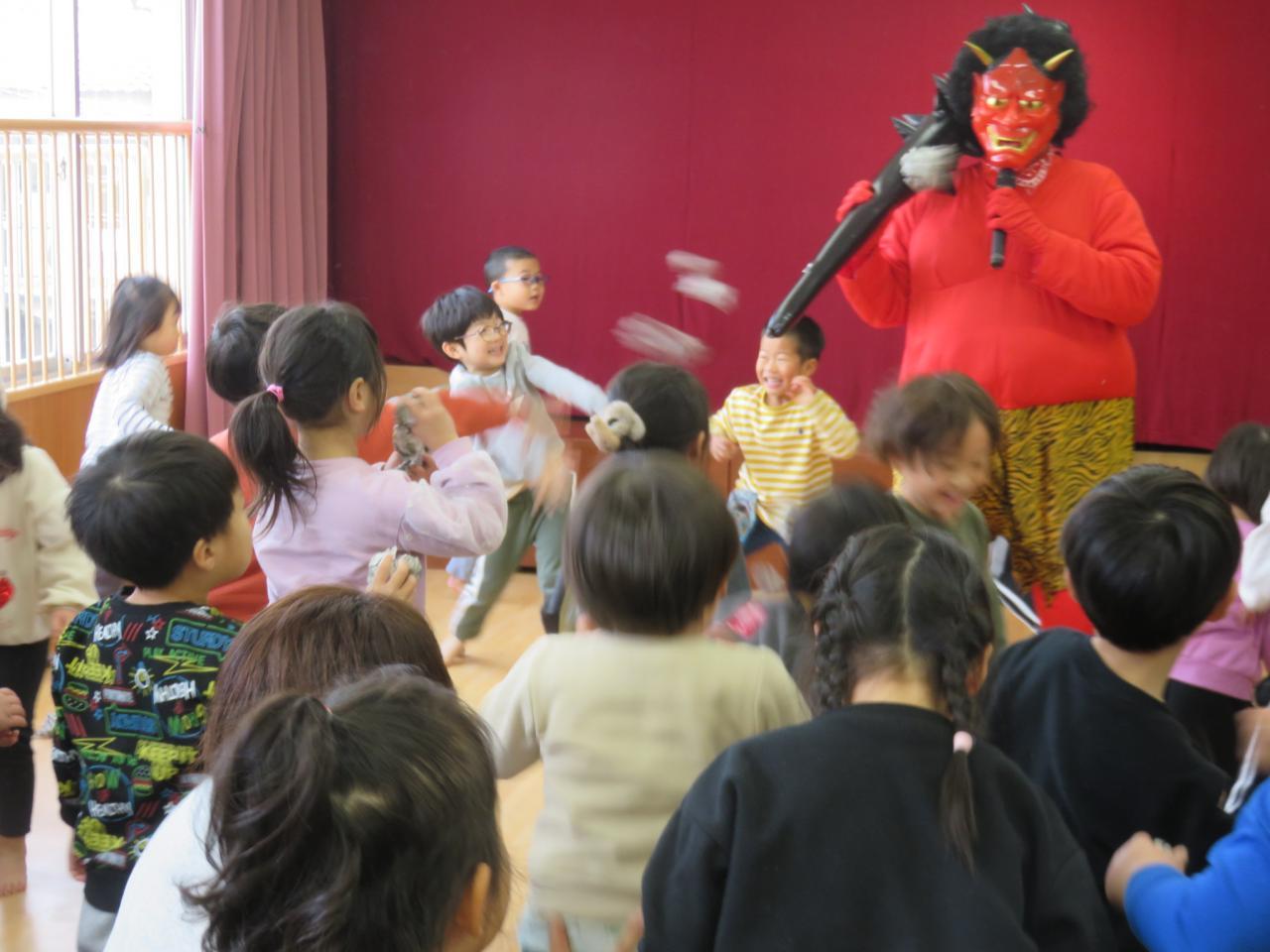 うさぎ組さんとひよこ組さんのお部屋には、かわいいお顔の赤鬼がやってきました。子どもたちは鬼がお部屋に入ってきてビックリしていましたが、ボールや新聞紙の豆を投げて、無事にお部屋から追い出すことができました。