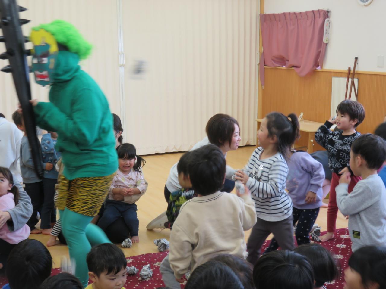 すると、こあら組さんとぱんだ組さんのところに緑鬼が、きりん組さんとぞう組さんのところには赤鬼がやってきました。豆に見立てた丸めた新聞紙を鬼に向かって果敢に投げる子、怖くて逃げ回る子、泣いてしまう子など様々でした。