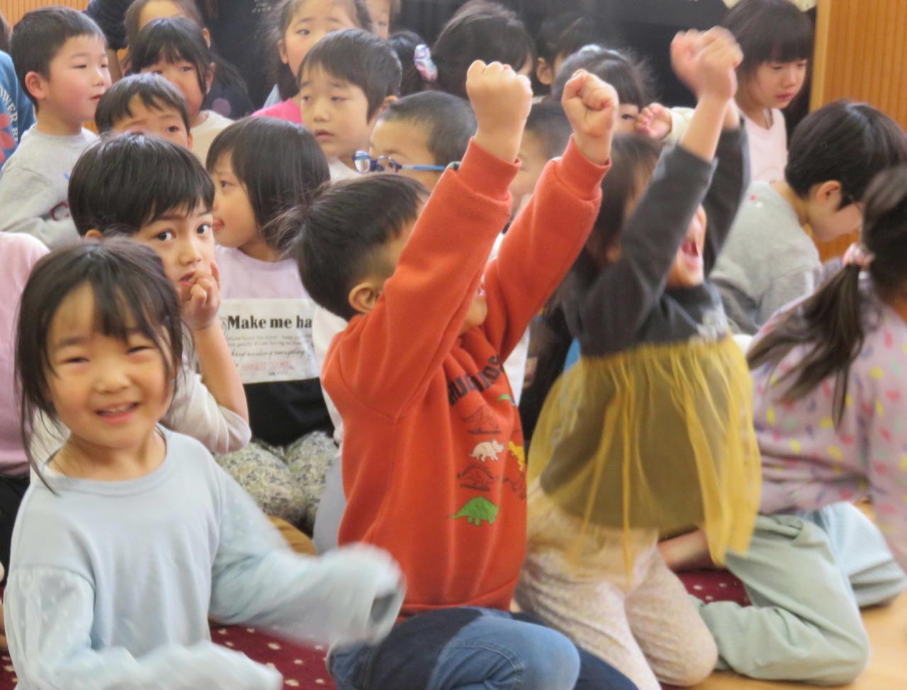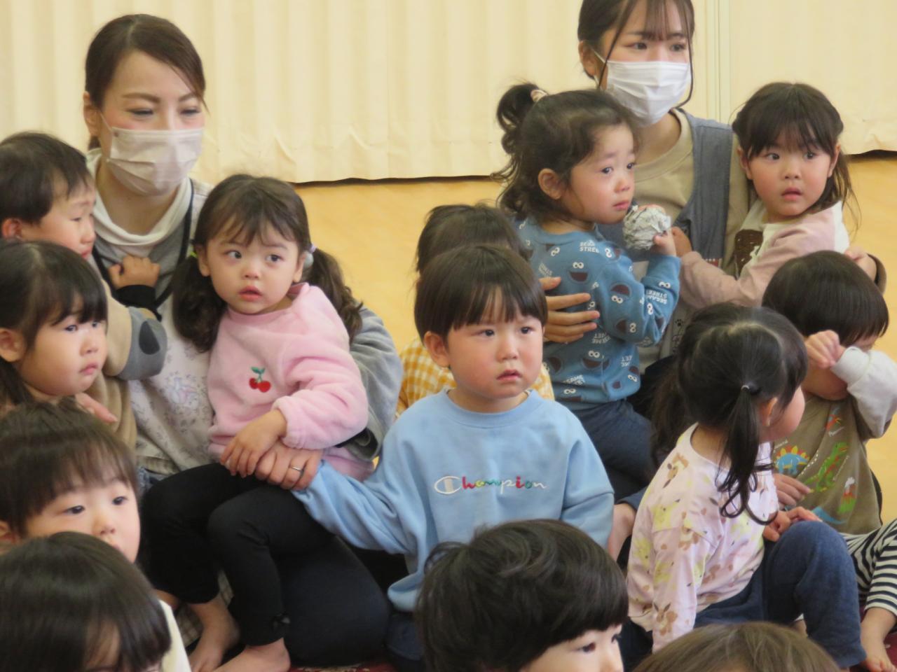 2~5歳児のクラスは遊戯室に集まり、節分のお話を聞いたり「まめまき」を歌いました。