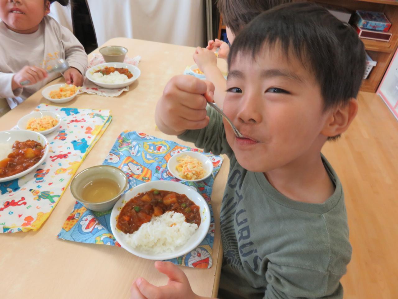 収穫したえんどう豆は調理室でゆでてもらい、うすいえんどうはハヤシライスに、スナップエンドウはマヨネーズで和えてもらって、給食の時間に食べました。
