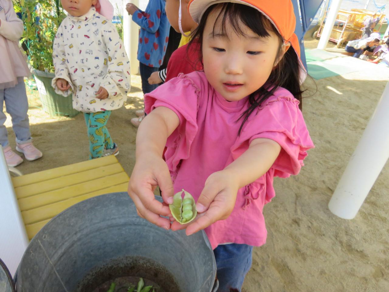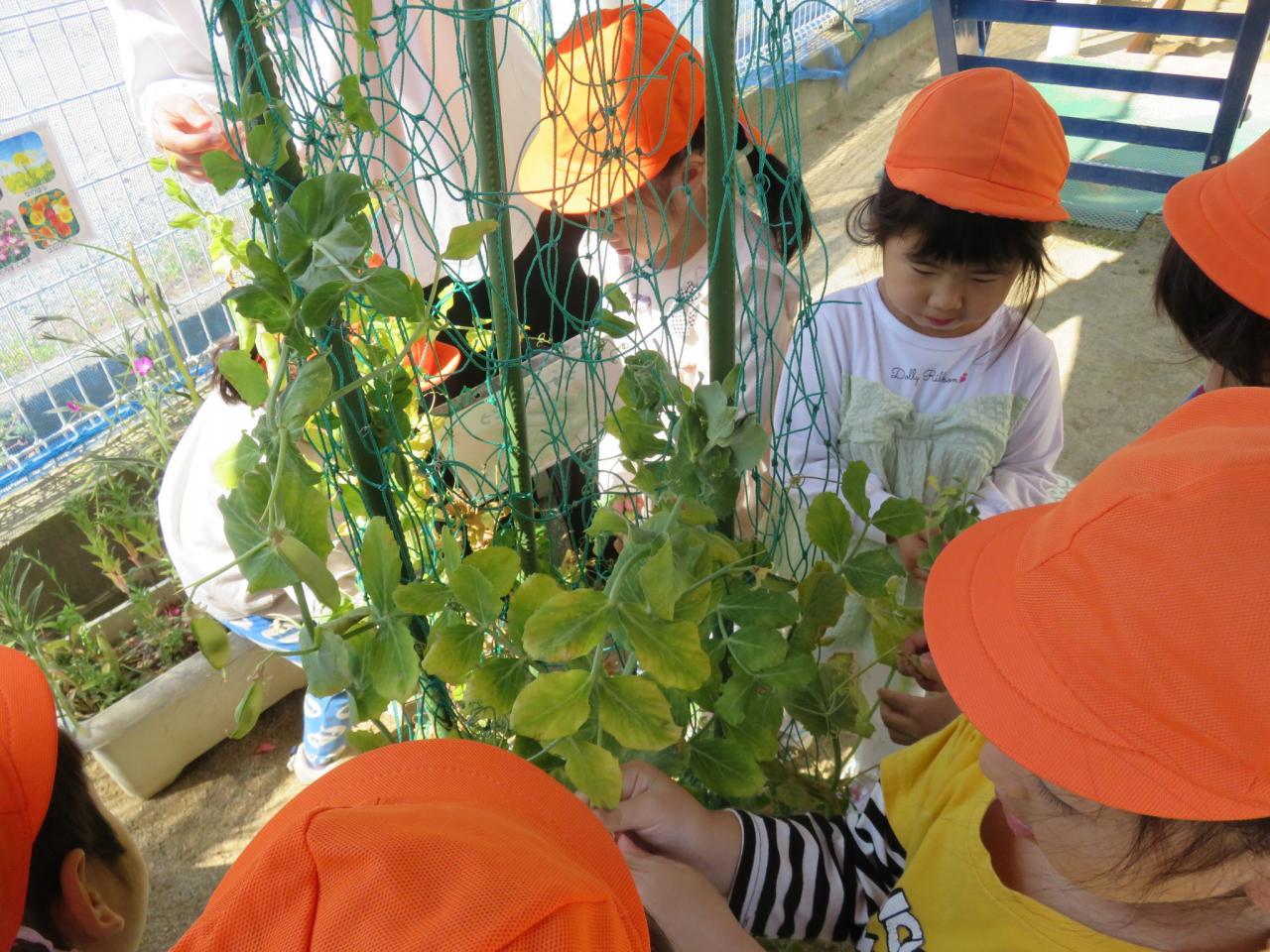 きりん組さんが昨年10月末に種まきをしたえんどう豆が、成長して実をつけたので、みんなで収穫しました。