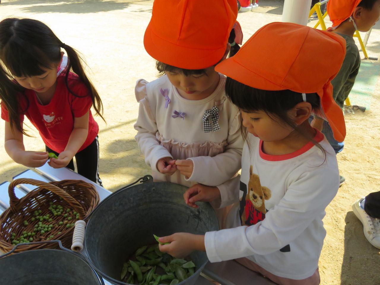 子どもたちは、指先を使って筋を取り莢を剥いて、「みてー!3こはいってた!」「おまめくんのべっどだ!」と言いながら、夢中になって豆を取り出していました。