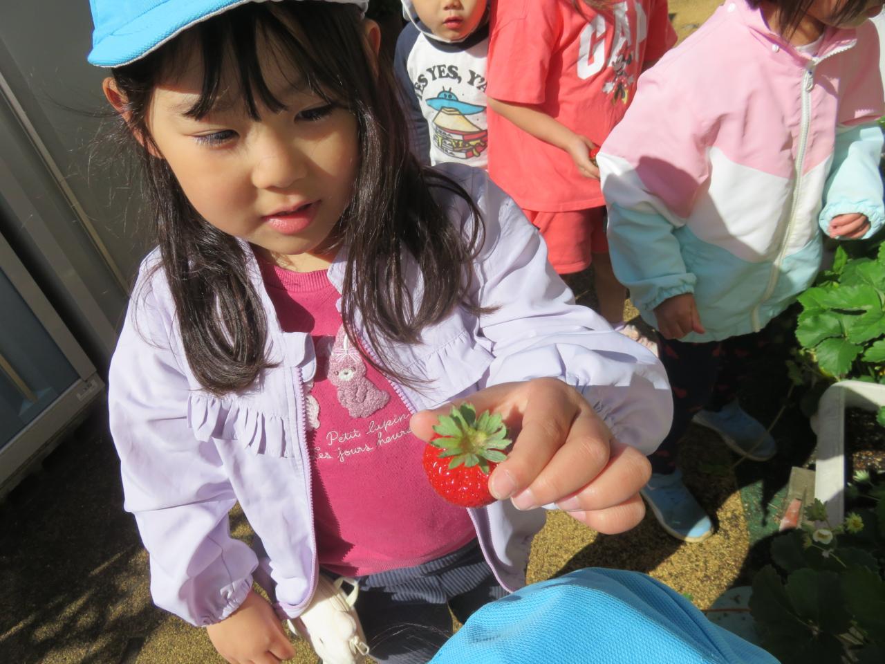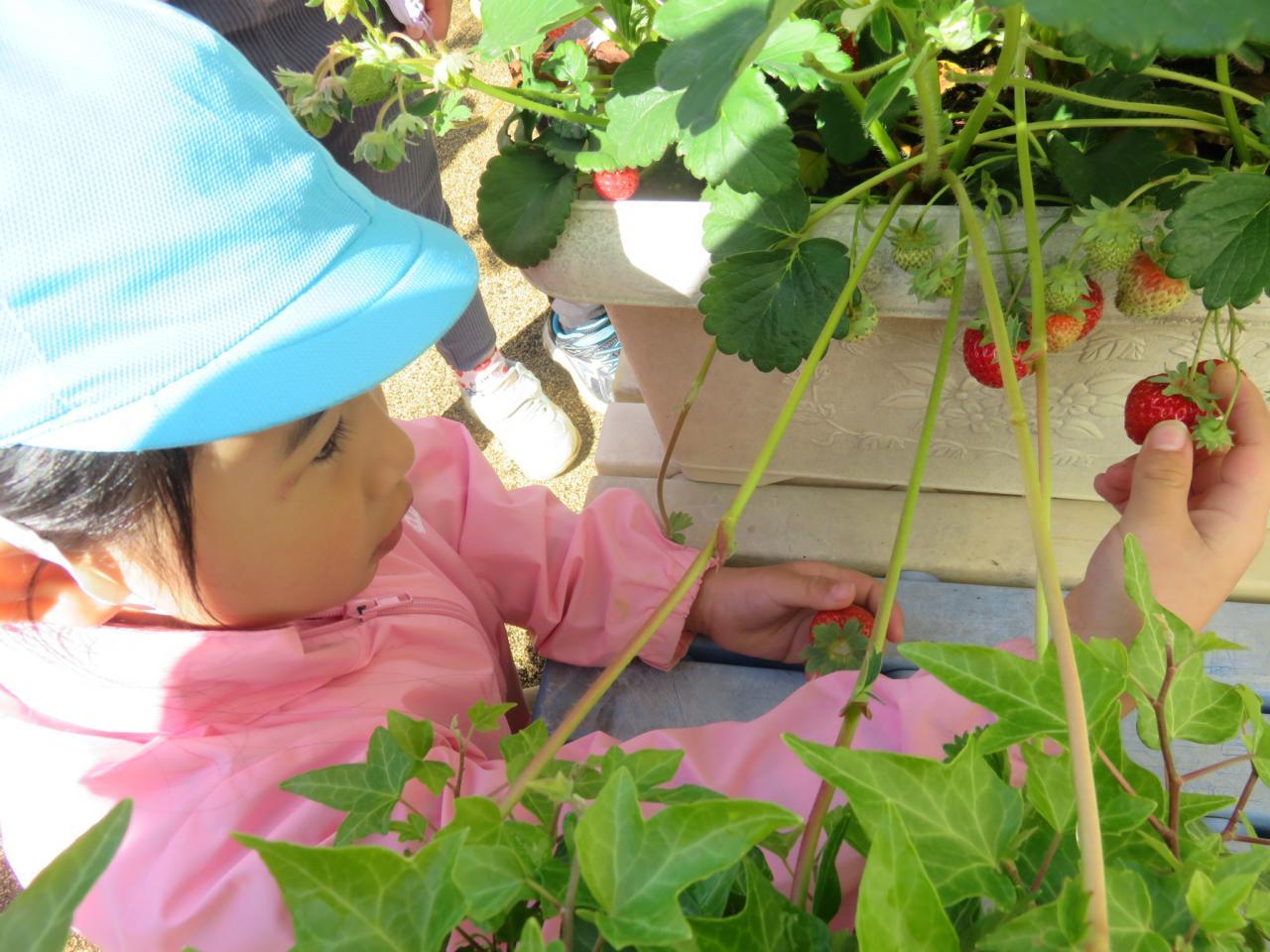まだ赤くなっていないイチゴを取らないように注意しながら、大きいのや小さいのを探しながら取りました。みんなでとったイチゴは全部で200個ほど。
