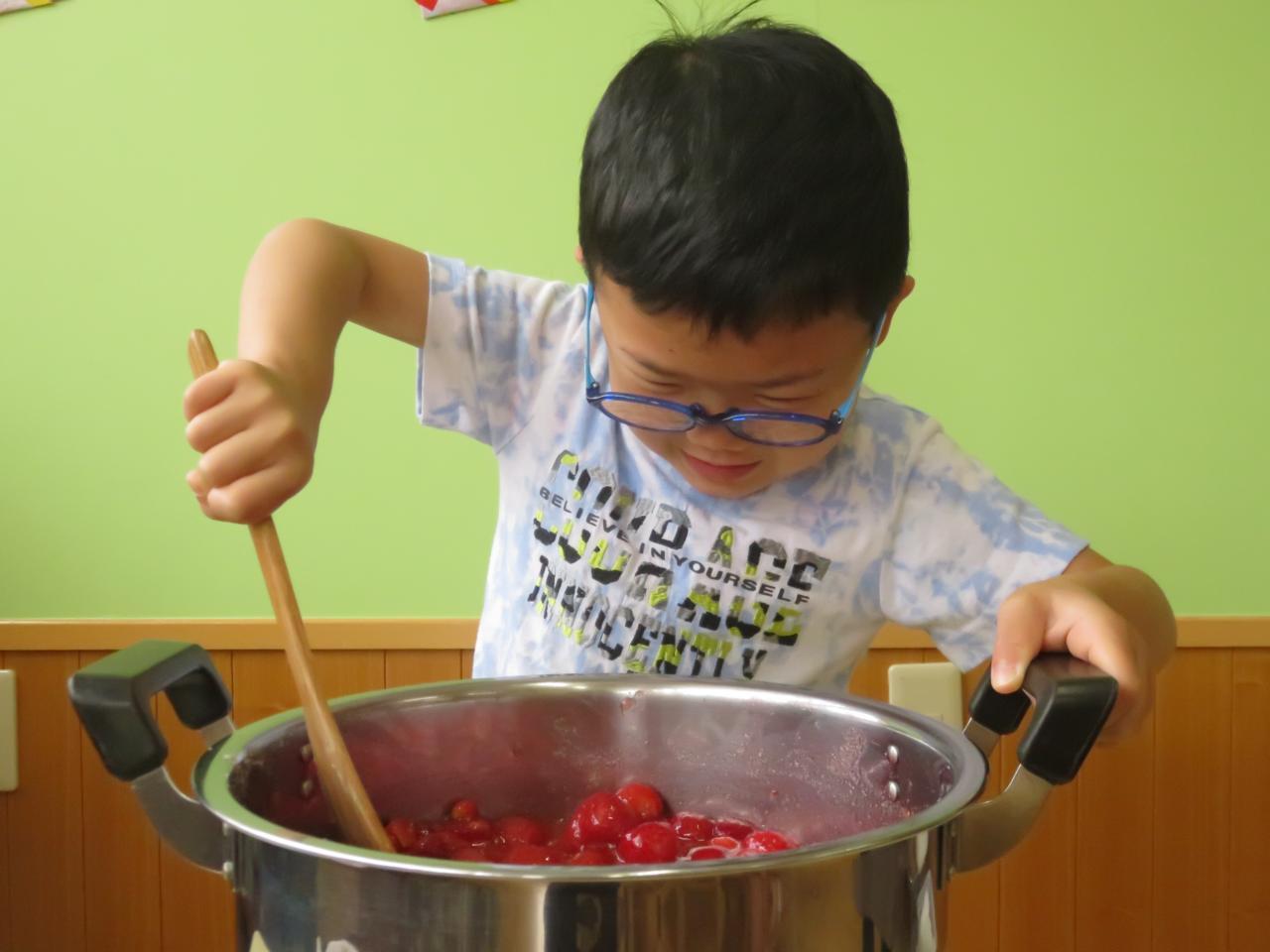みんなが混ぜ終わったら、出来上がりまで煮詰める作業を給食の先生にお願いして、後はおやつの時間までワクワクしながら過ごしていました。