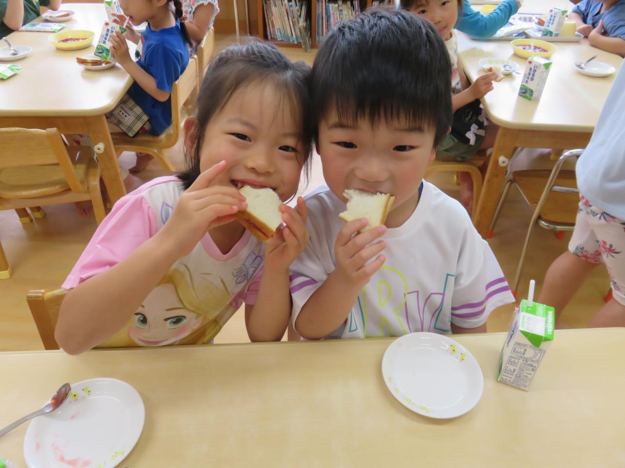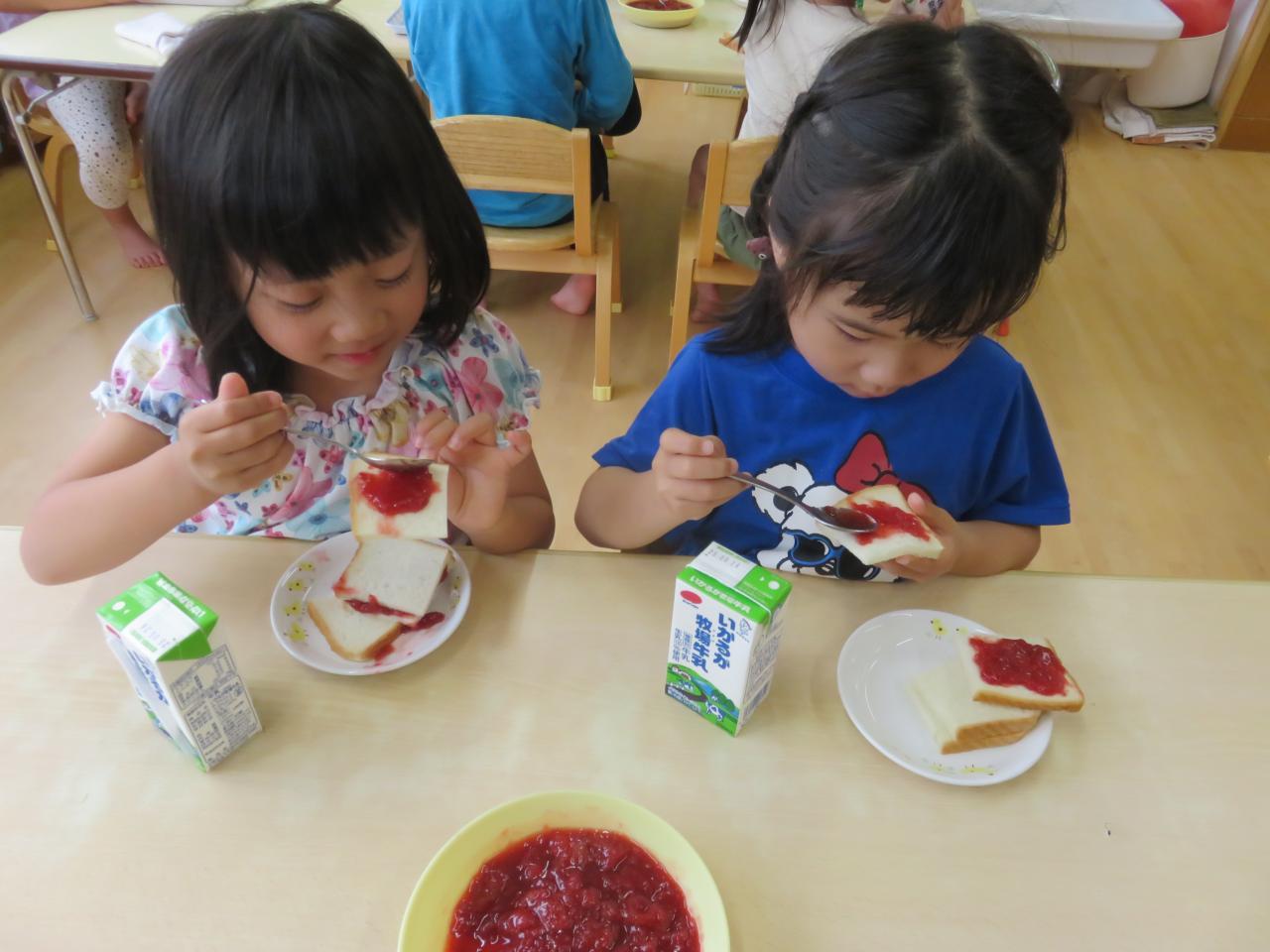 そしておやつの時間になり、器にたっぷり入ったイチゴジャムを見て子どもたちは大喜び!食パンに自分でジャムを塗って、ジャムサンドにして食べました。