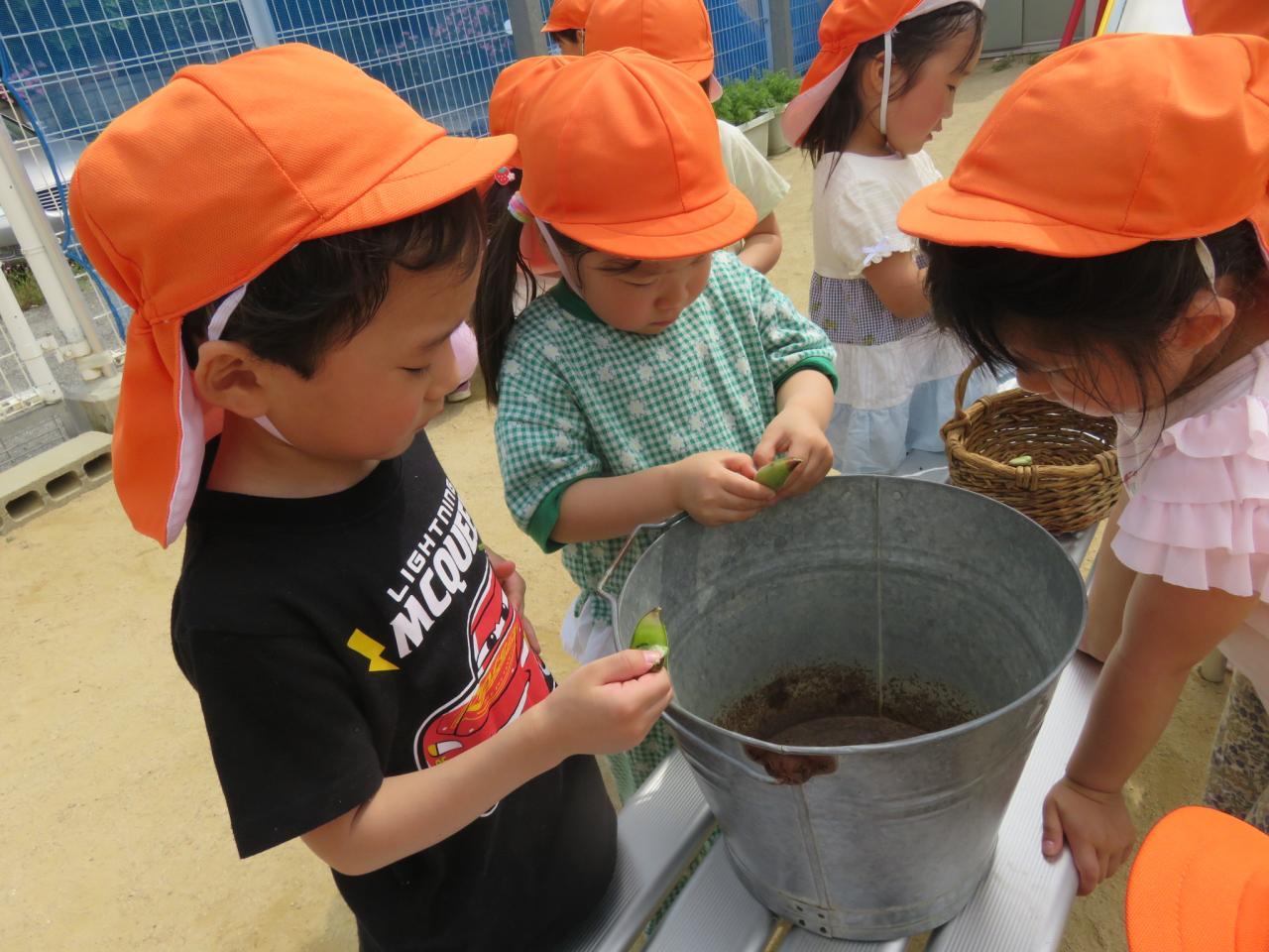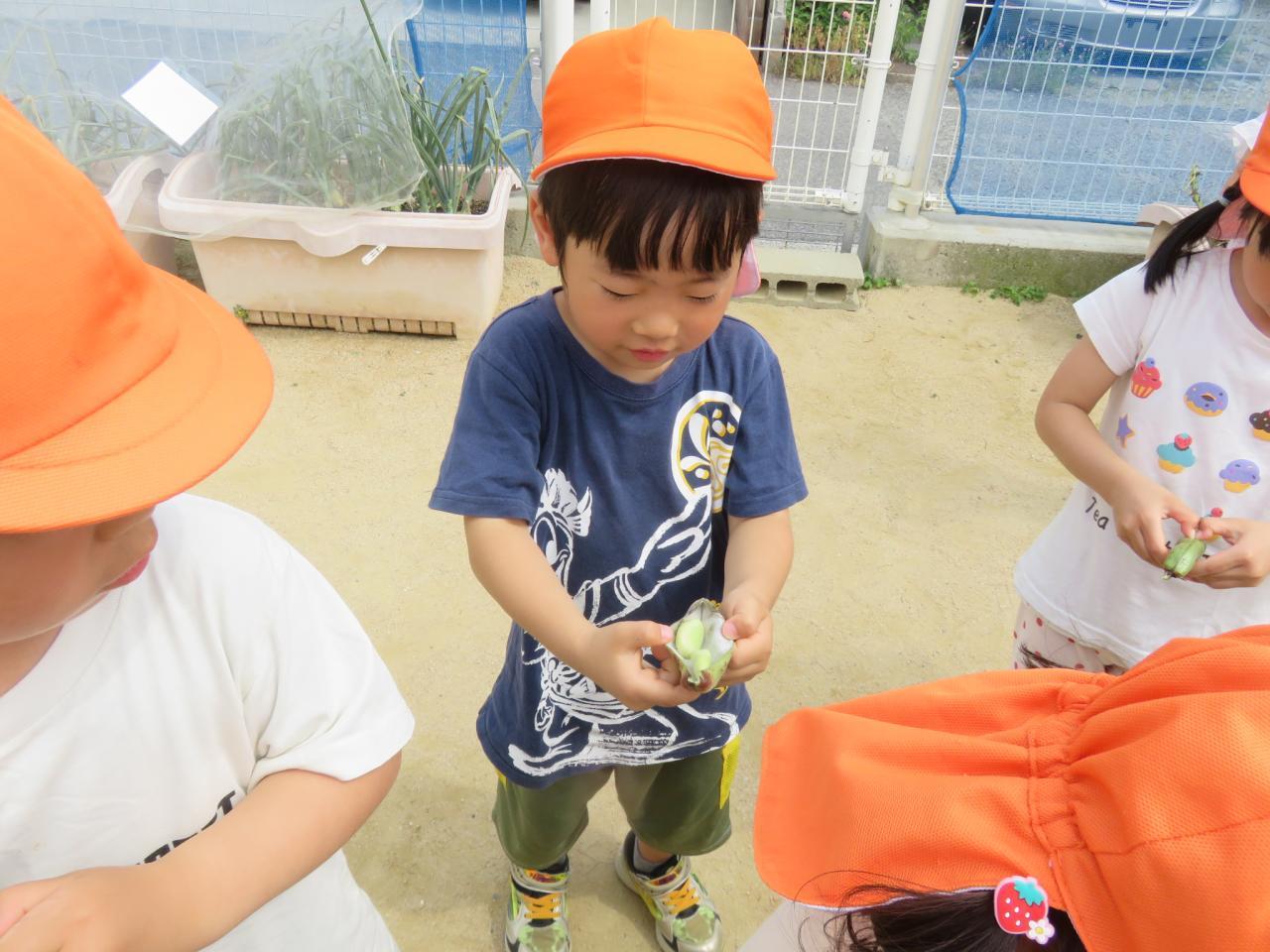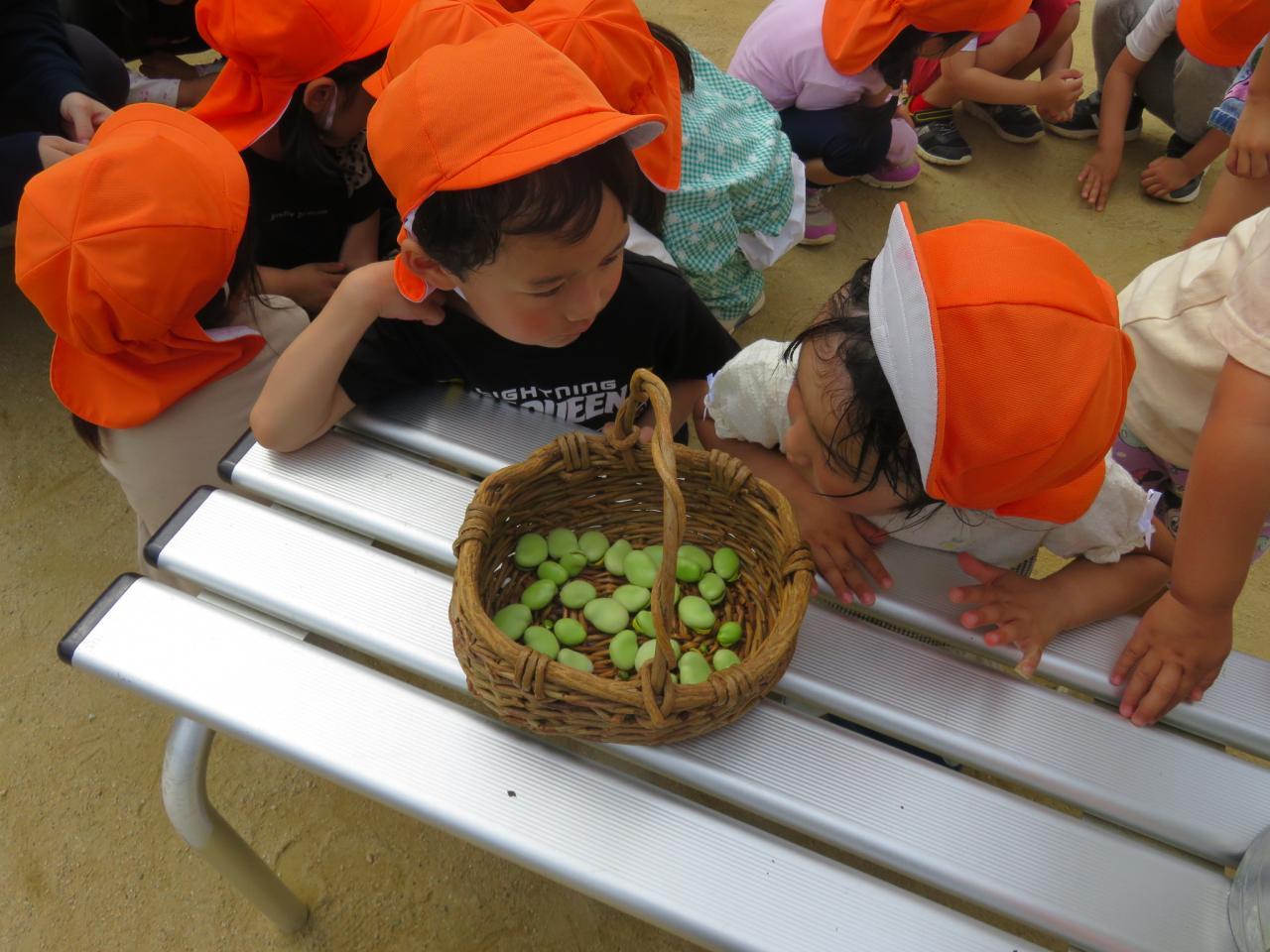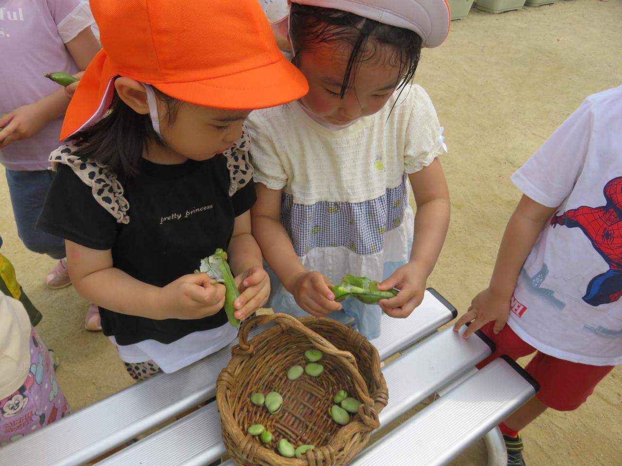 昨年10月にまいた3種のお豆のうちまだ収穫していなかった、そら豆を収穫しました。莢から身を取り出していると「そらまめくんのべっどだ!」と、絵本と同じ莢のベッドがあることに驚きながらも、ふわふわした内側を指で触って楽しんでいました。