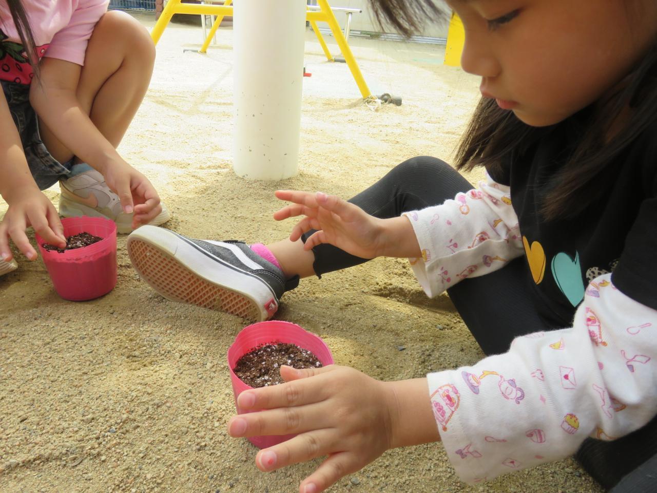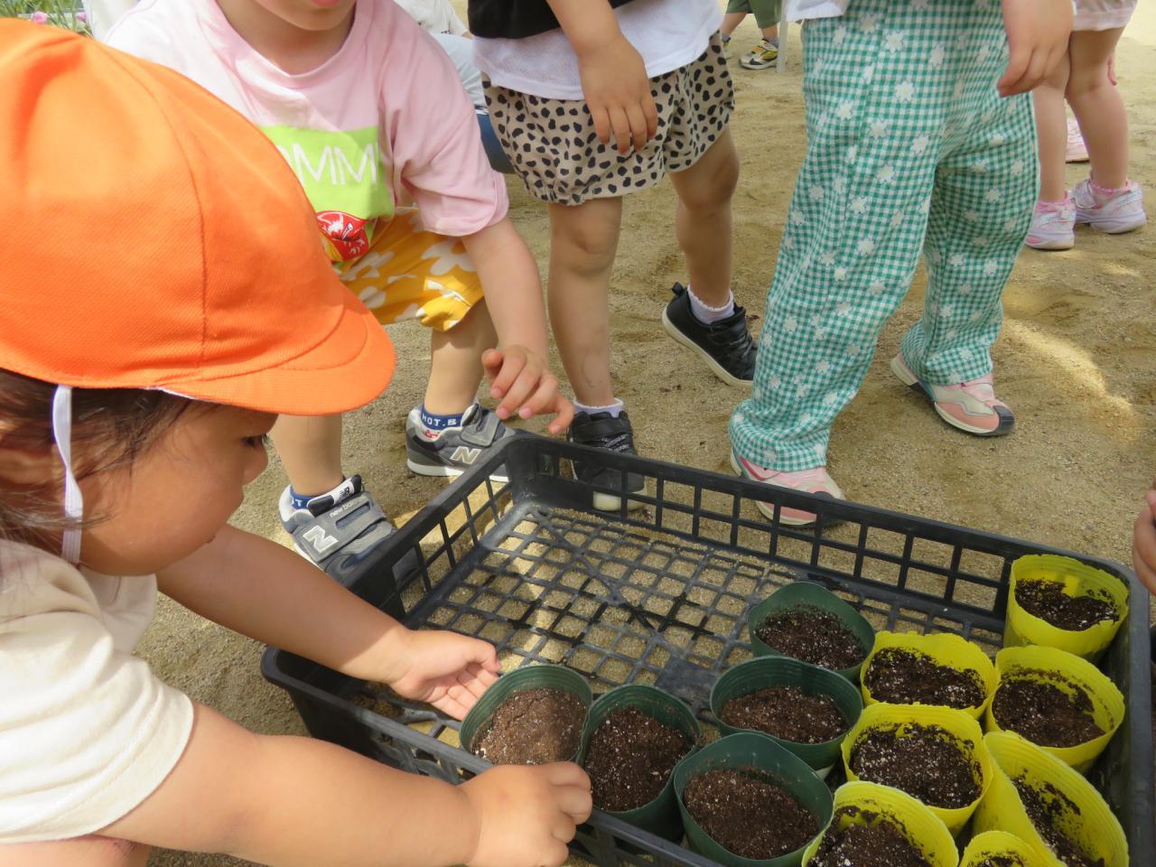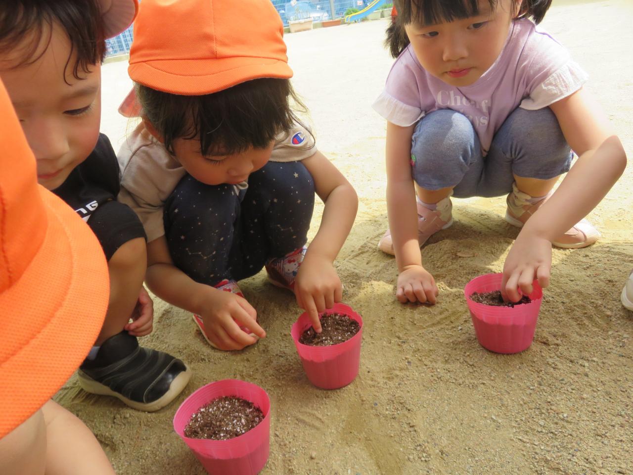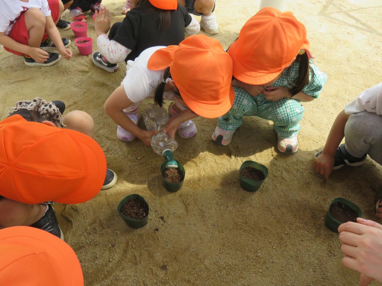 収穫が終わると今度は3つのグループに分かれ・あさがお・ひまわり・ふうせんかずらの3種類の花の種をまきました。