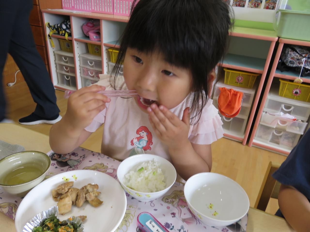 みんながとったそら豆は、揚げ焼きしてから小さくほぐして、そら豆ふりかけにしてもらいました。給食の時間、きれいな緑色のふりかけを、ごはんにかけてもらって食べました。「おいいしい!」「にがい…」と感想は様々でしたが、収穫から食べる所までを楽しめた様子でした。