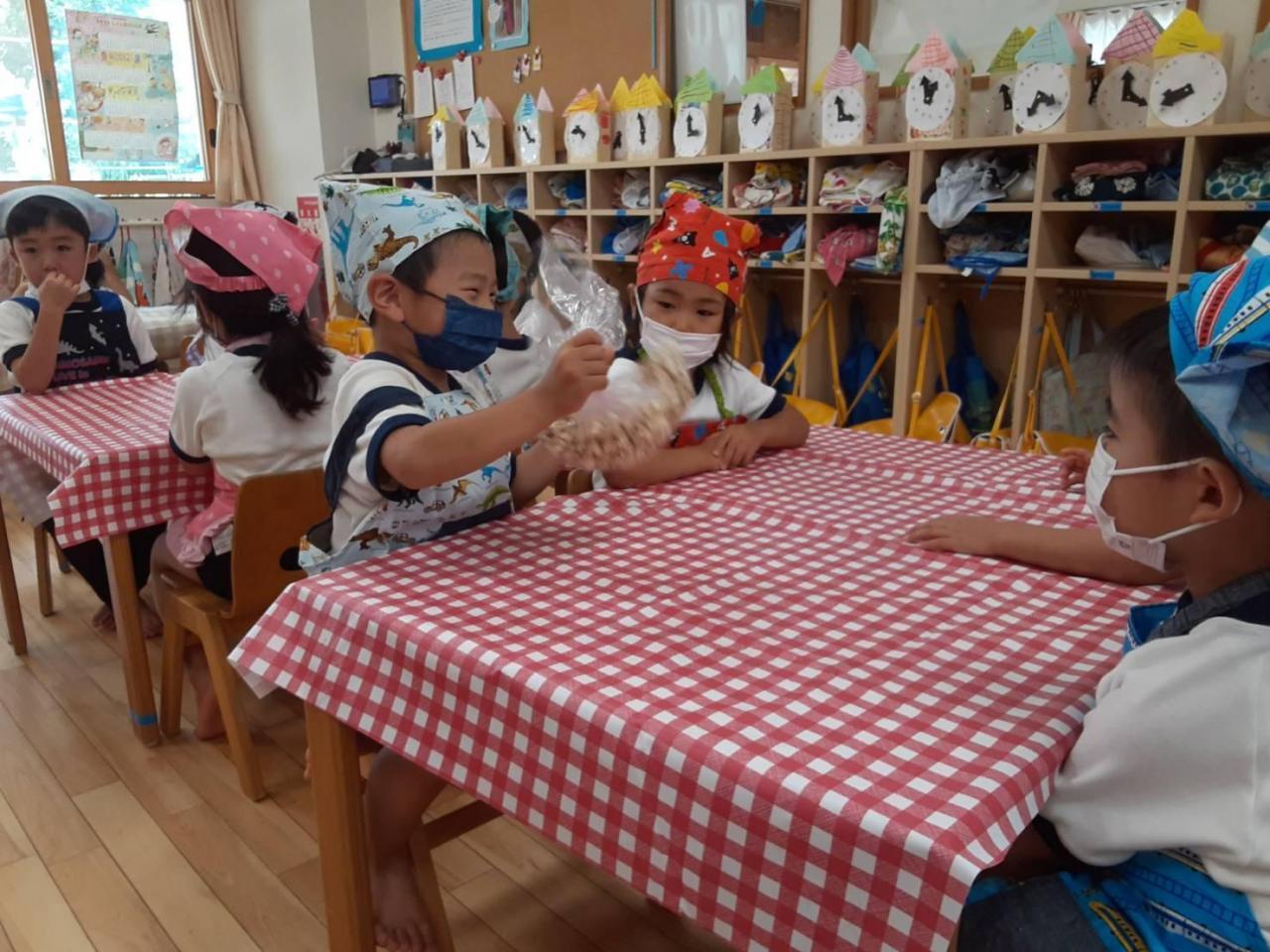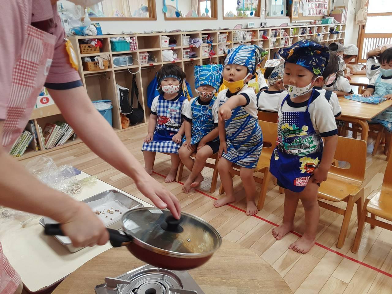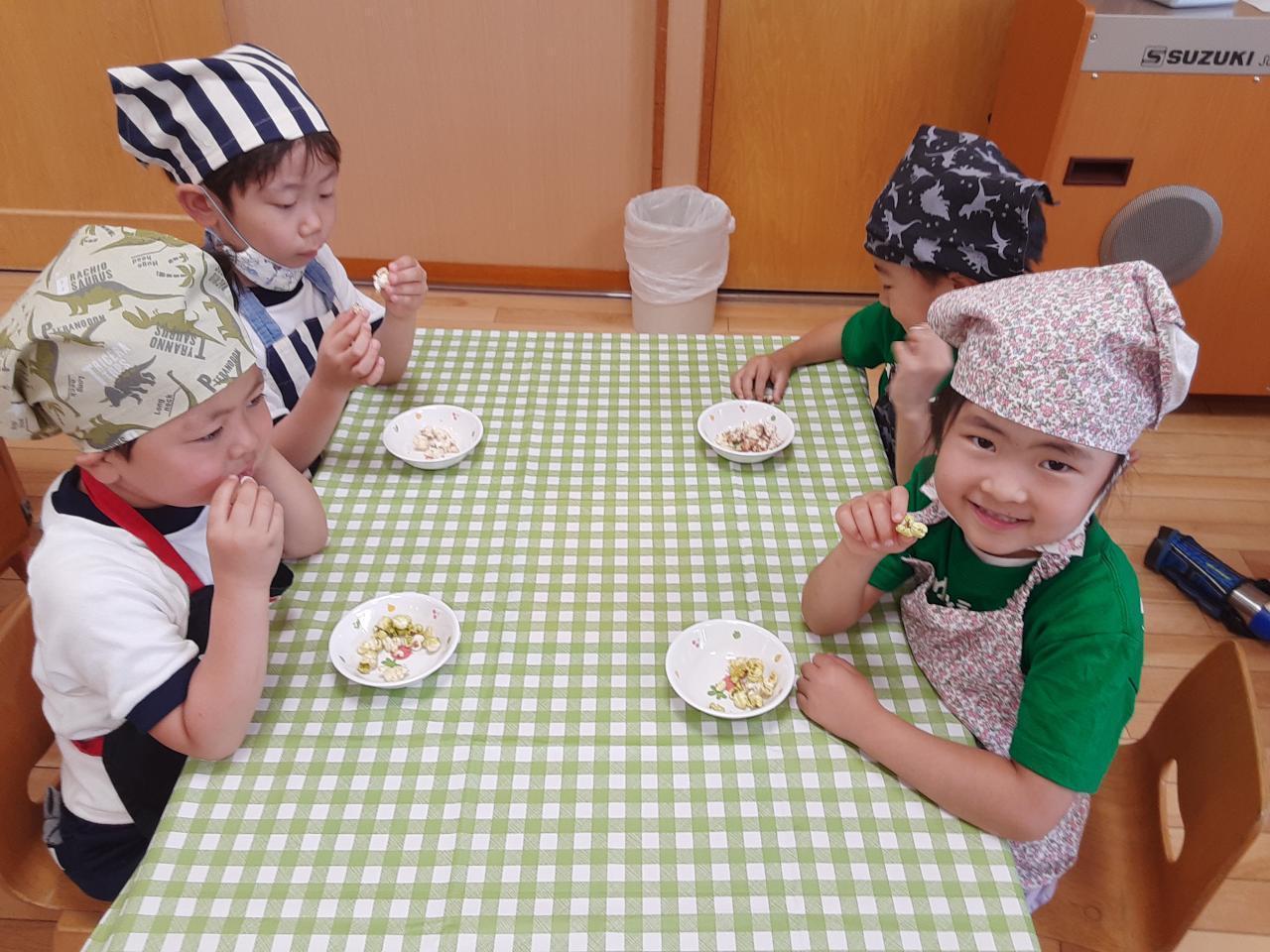 クッキングでポップコーン作りをしました。フライパンにポップコーンの種とバターを入れ、少し待つと”ポンポン”と音が鳴り、「ポップコーン できてきた~」と嬉しそうに話していた子どもたち。出来上がったポップコーンを袋に入れ「抹茶・コンソメ・のり塩・ココア」の粉をそれぞれの袋に入れ、子どもたちに振ってもらいました。色が変わってくると「おいしそ~」や「はやくたべた~い!」と言って、待ち遠しく眺めていました。みんなで「いただきま~す」をすると、「ココアおいし!」や「みんなでつくったのおいしね!」と話しながら、皆で作ったポップコーンを美味しそうに食べていました。
