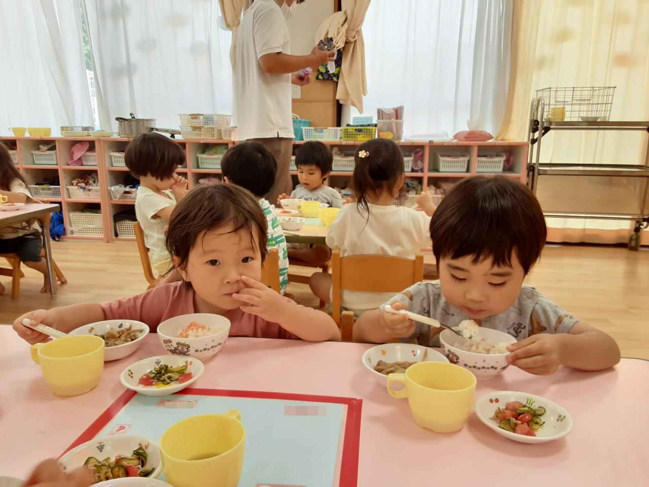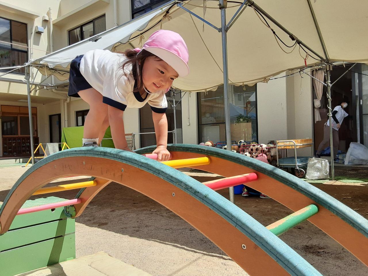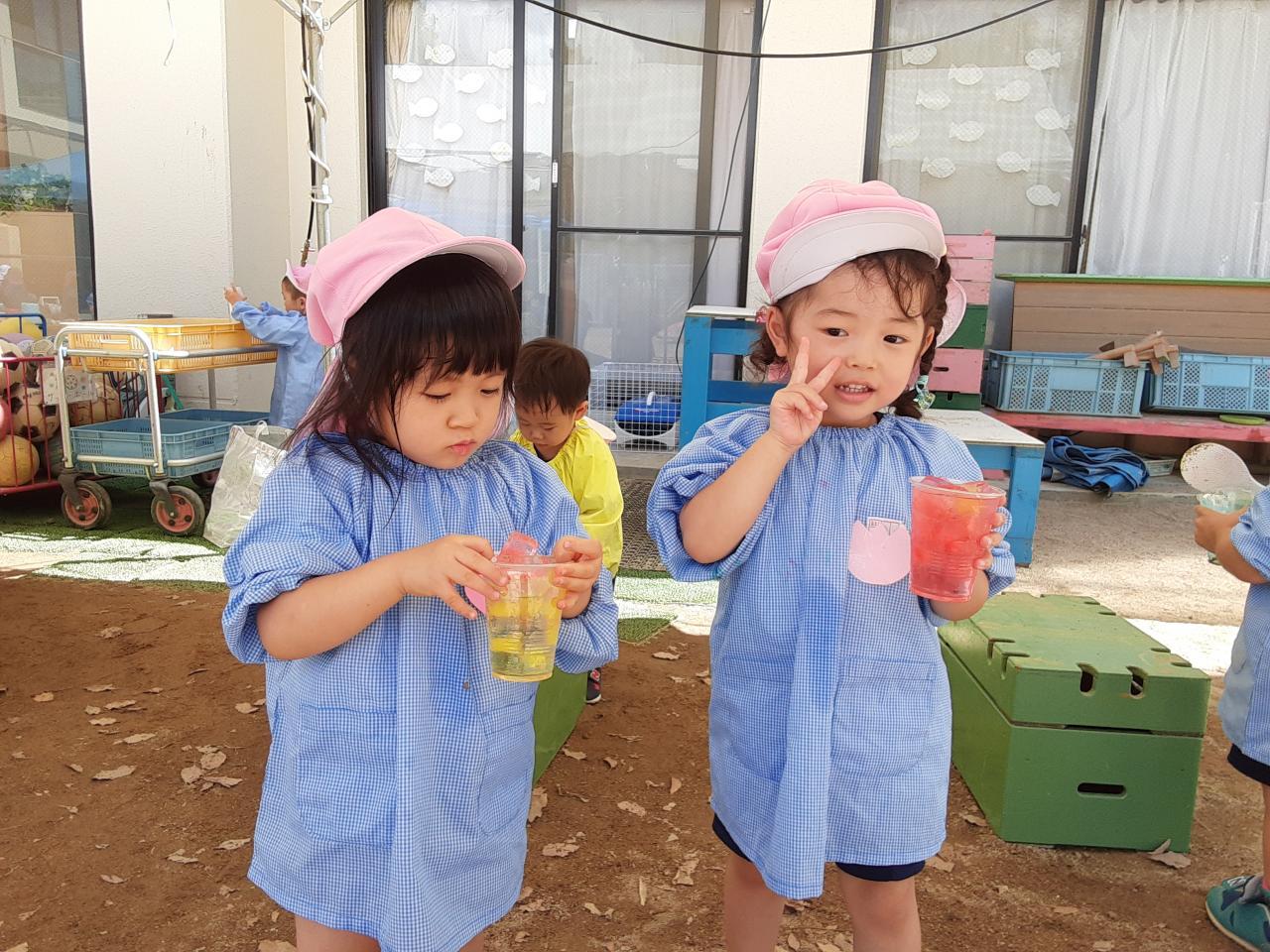 日差しの強い日が続いていますが、子どもたちは元気いっぱい!園庭では、氷あそびコーナーを作りました。氷を指先でチョンチョンと触ったり、手のひらに乗せたりすると「つめたい!」「カチカチだね!」と笑い合っていた子どもたち!コップに氷と水をいれて「りんごジュースだよ!」とジュースを作る子もいました。また、園庭に新しくできた遊具にも挑戦しています。初めは少し怖くて、恐る恐るチャレンジしていましたが、今では「せんせい!みててな~」と自信満々です。たくさん遊んだ後には、大好きな給食!モリモリ食べ、完食すると「おかわり!」と元気な声が飛び交っている桃組さんです。