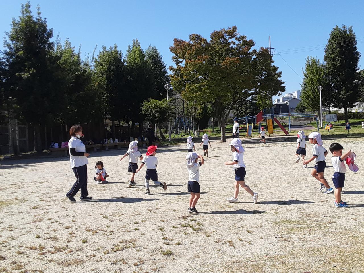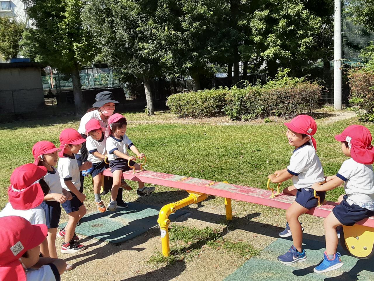 公園に着くとまず、みんなで増え鬼や氷鬼をしました。ルールの話も集中して聞いて、いざ始まるとたくさん走り回り、とっても盛り上がりました。その後は、公園にある遊具で遊びました。シーソーや登り棒など普段できないものも順番を守りながら、楽しむことができました。